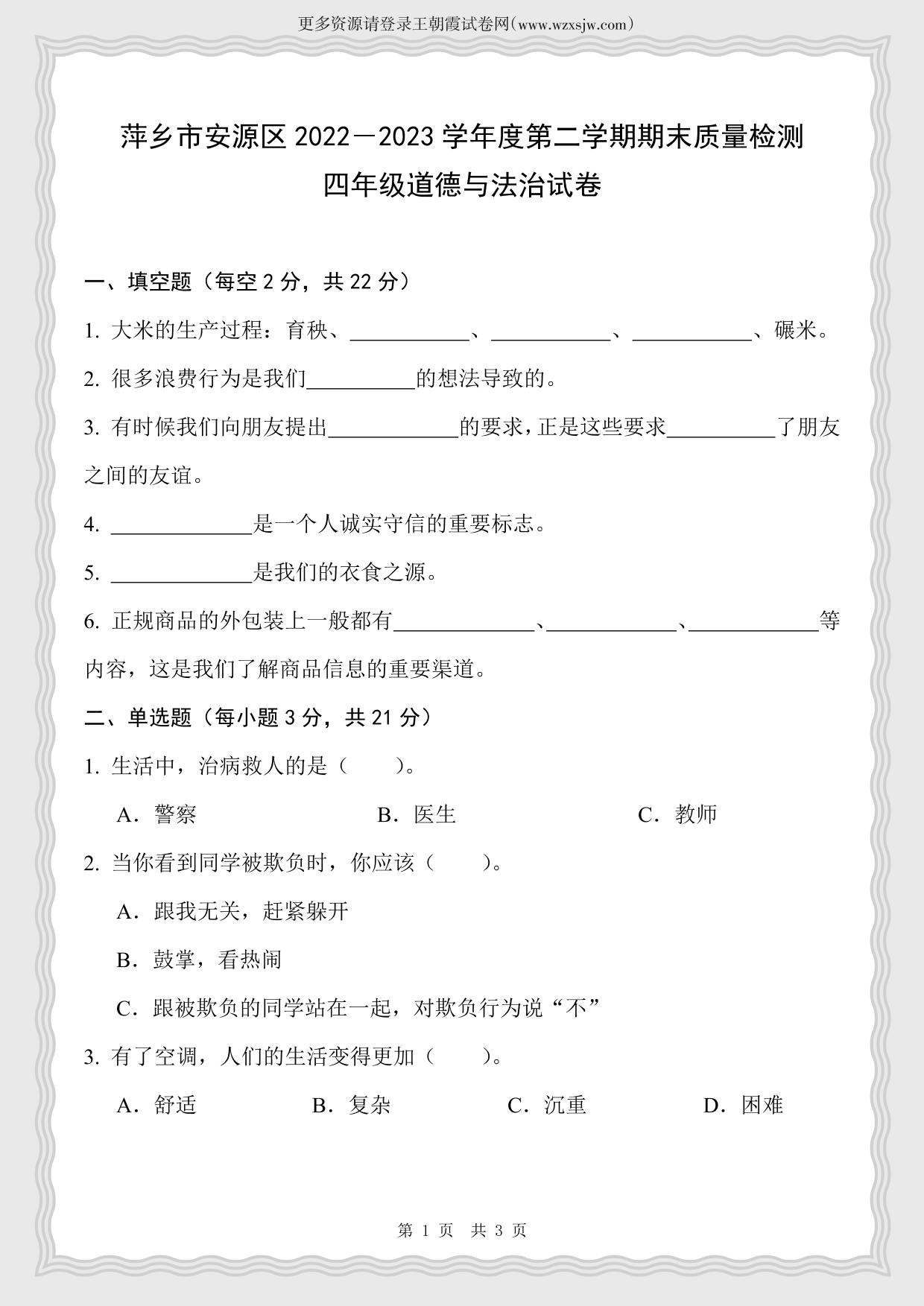 江西省萍乡市安源区2022-2023学年度第二学期期末质量检测试卷四年级道德与法治(人教版)