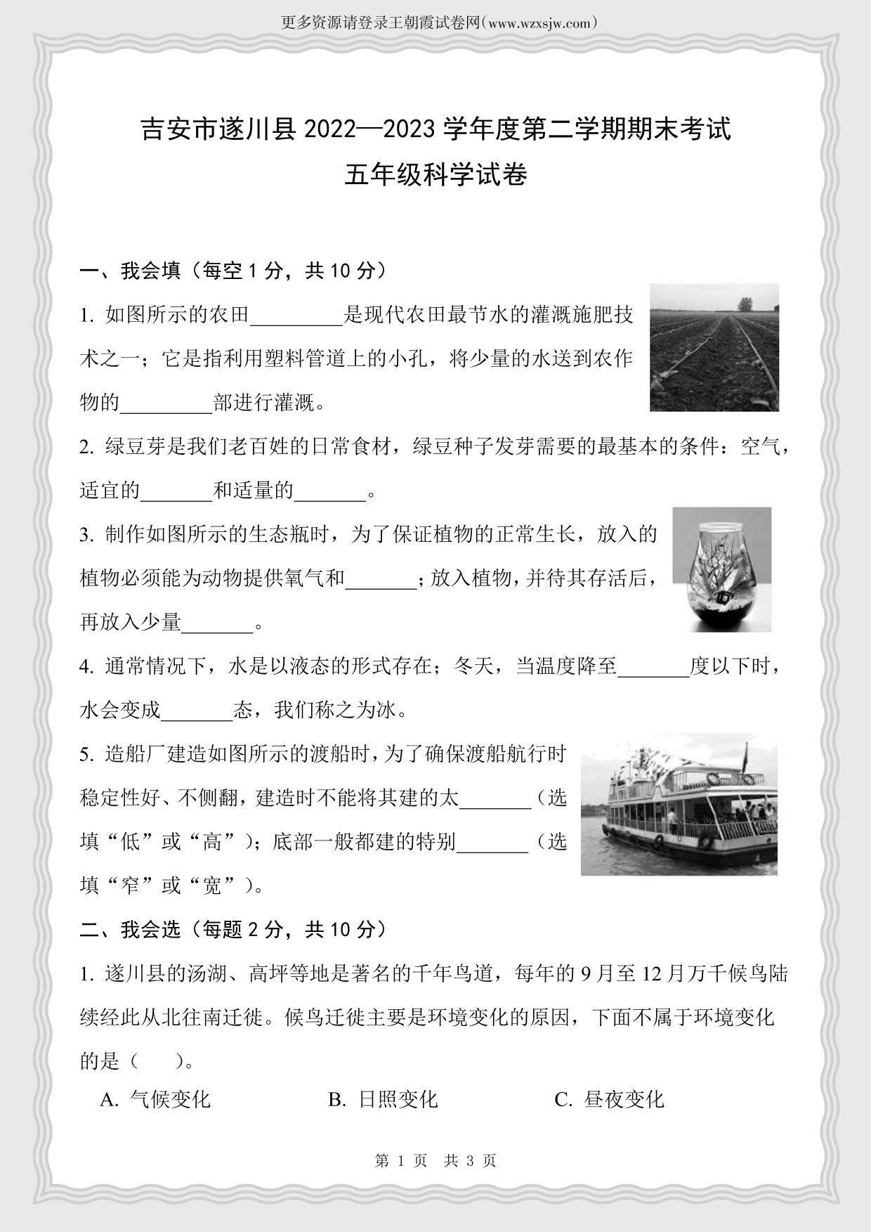 江西省吉安市遂川县2022-2023学年度第二学期期末考试试卷五年级科学(教科版)