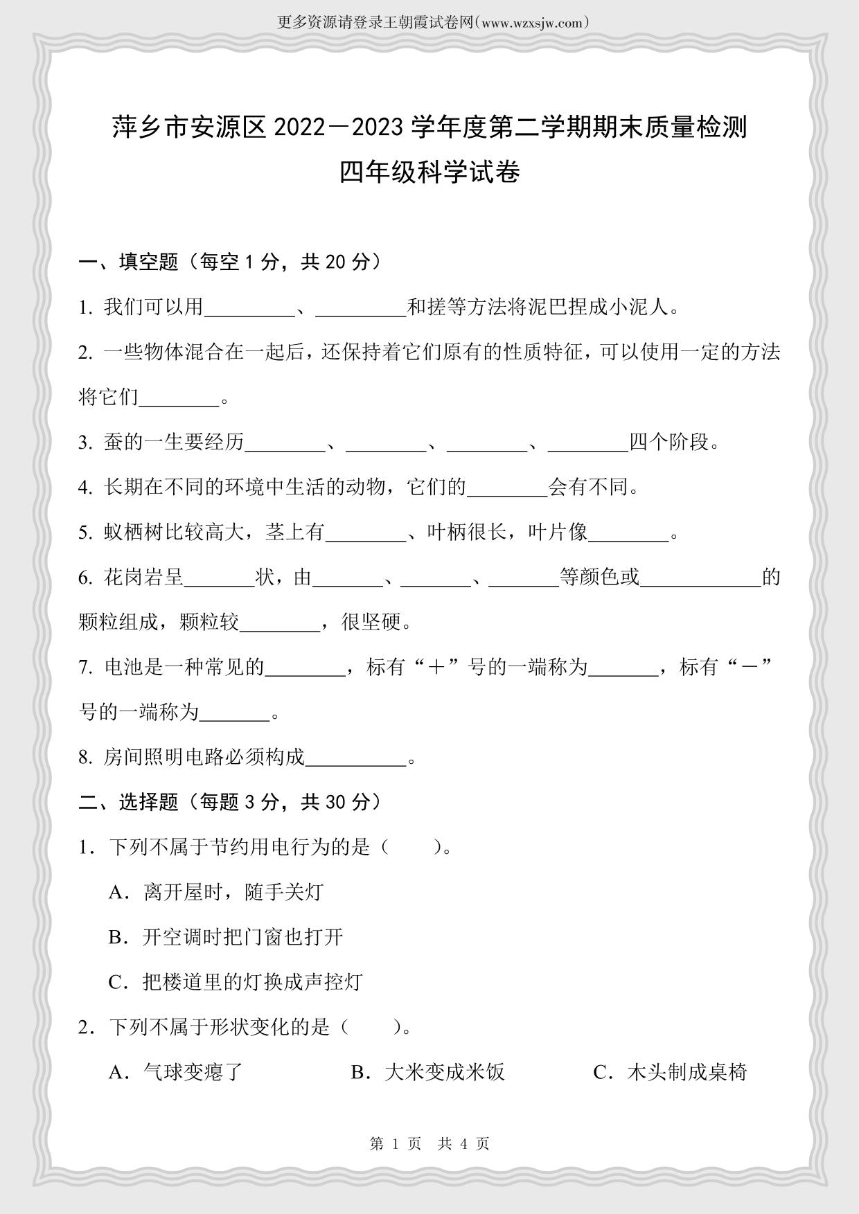 江西省萍乡市安源区2022-2023学年度第二学期期末质量检测试卷四年级科学(湘科版)
