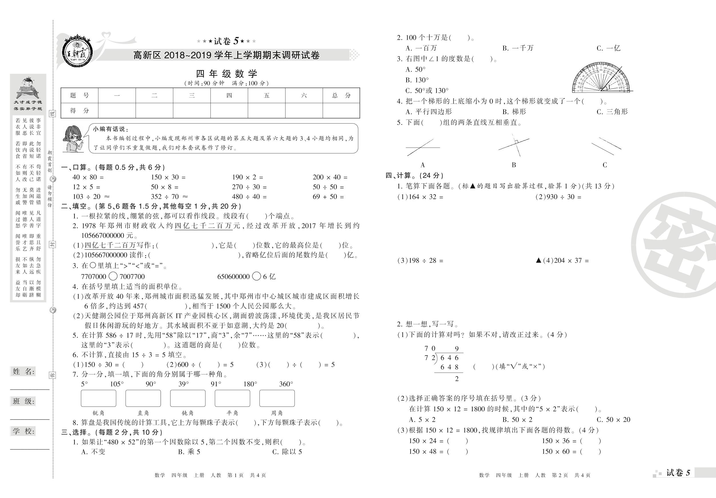 2018-2019学年第一学期郑州市高新区四年级数学试卷(人教版)【5】