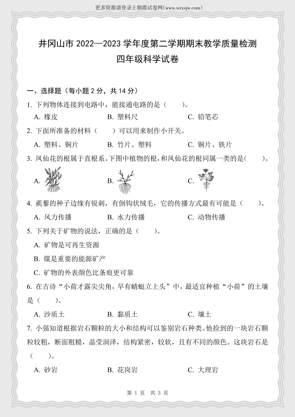 江西省井冈山市2022-2023学年度第二学期期末教学质量检测试卷四年级科学(教科版)