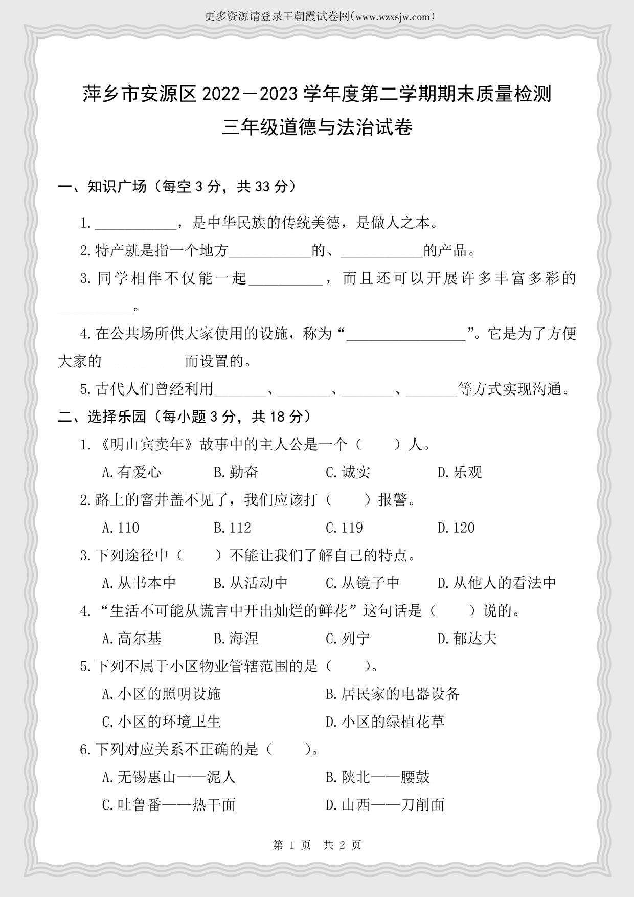 江西省萍乡市安源区2022-2023学年度第二学期期末质量检测试卷三年级道德与法治(人教版)