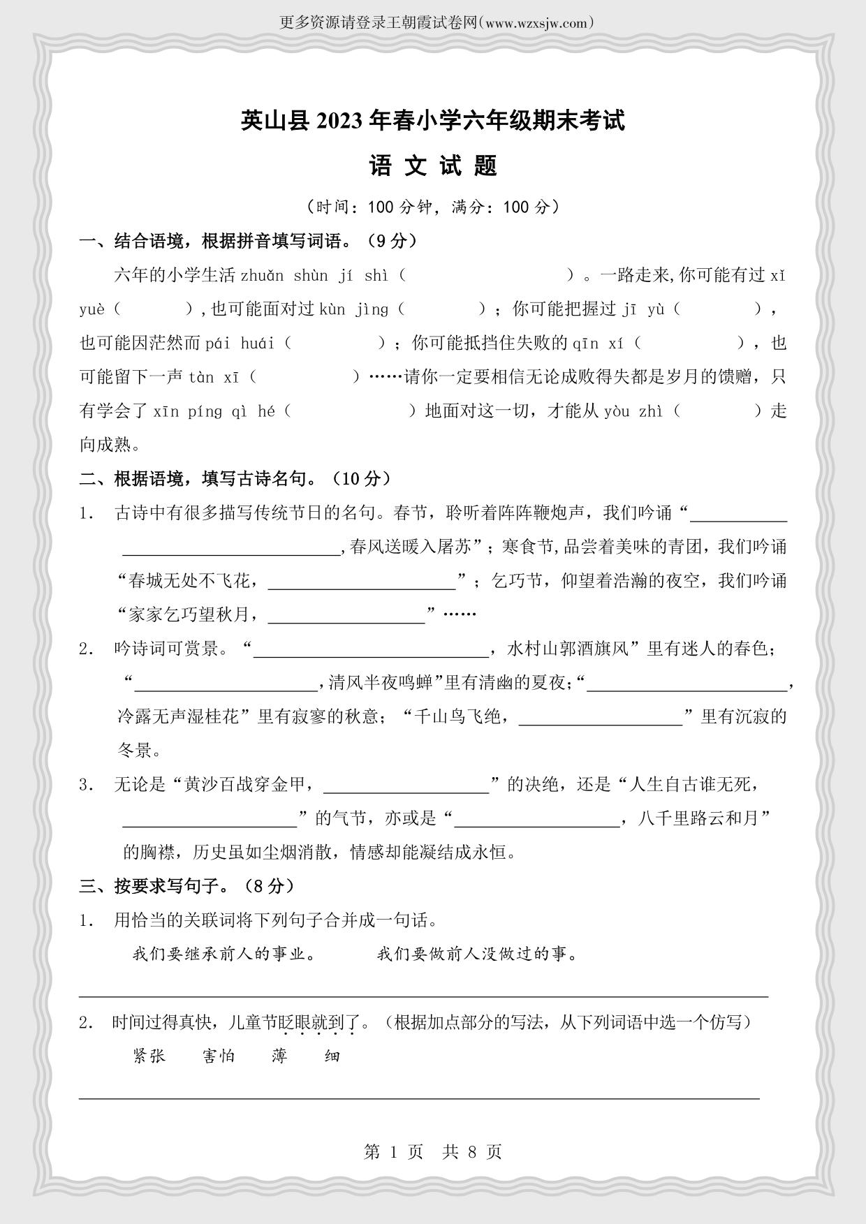 湖北省黄冈市英山县2022-2023学年下学期期末考试试题六年级语文(人教版)