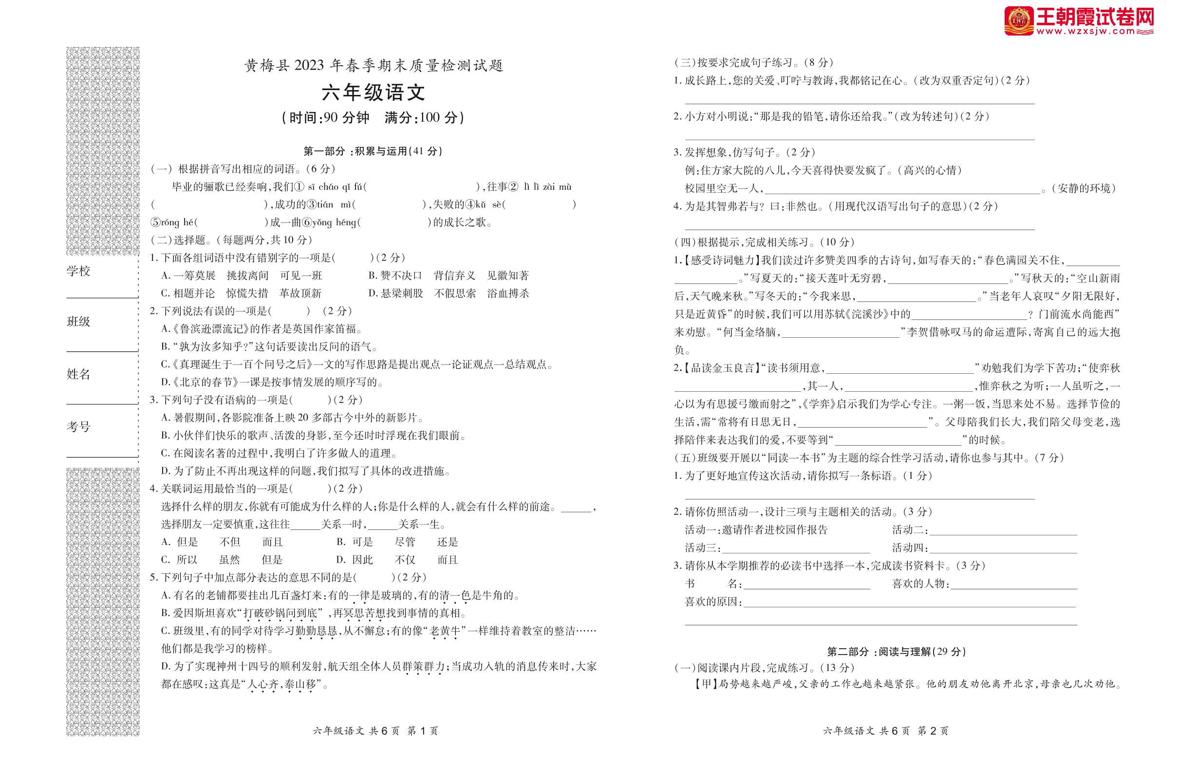 湖北省黄冈市黄梅县2022-2023学年下学期期末质量检测试题六年级语文(人教版)
