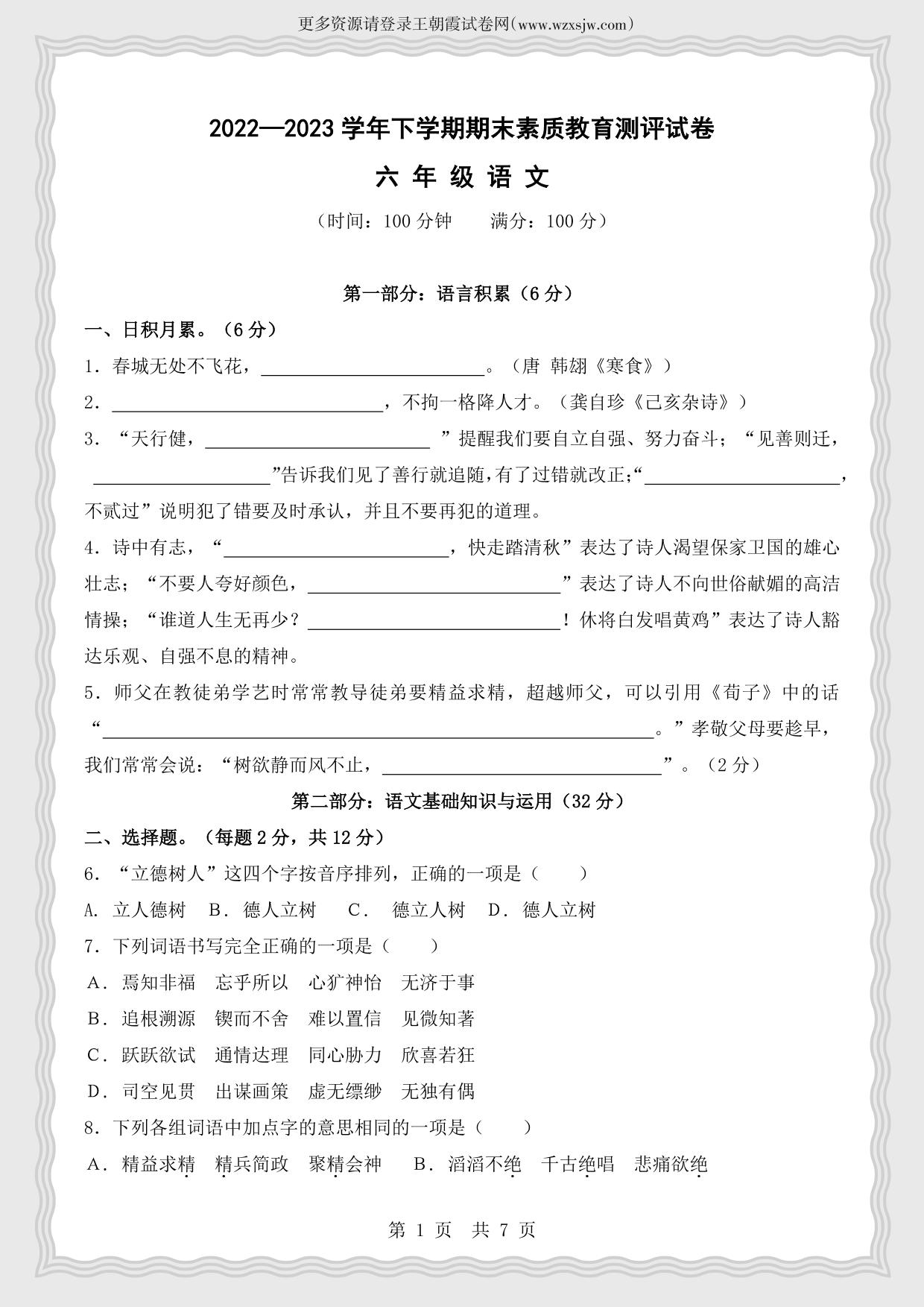 六年级语文人教版下册期末卷
