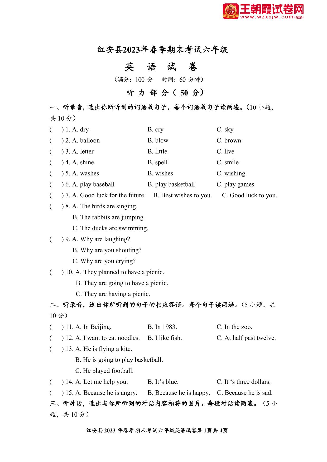 湖北省黄冈市红安县2022-2023学年下学期期末考试试卷六年级英语(外研版)【无听力音频】