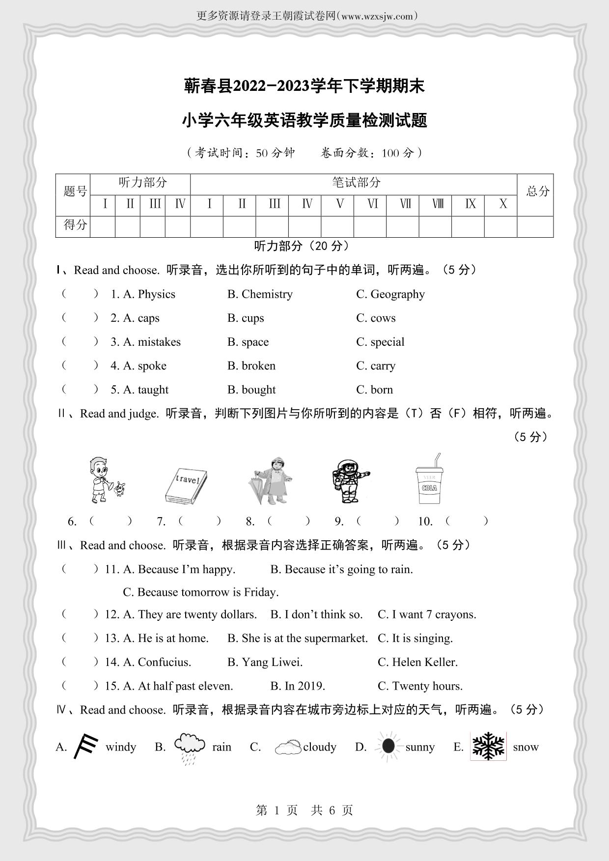 湖北省黄冈市蕲春县2022-2023学年下学期期末教学质量检测试题六年级英语(外研版)【无听力音频】
