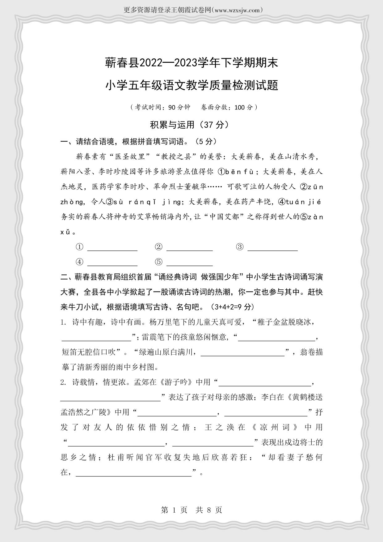 湖北省黄冈市蕲春县2022-2023学年下学期期末教学质量检测试题五年级语文(人教版)