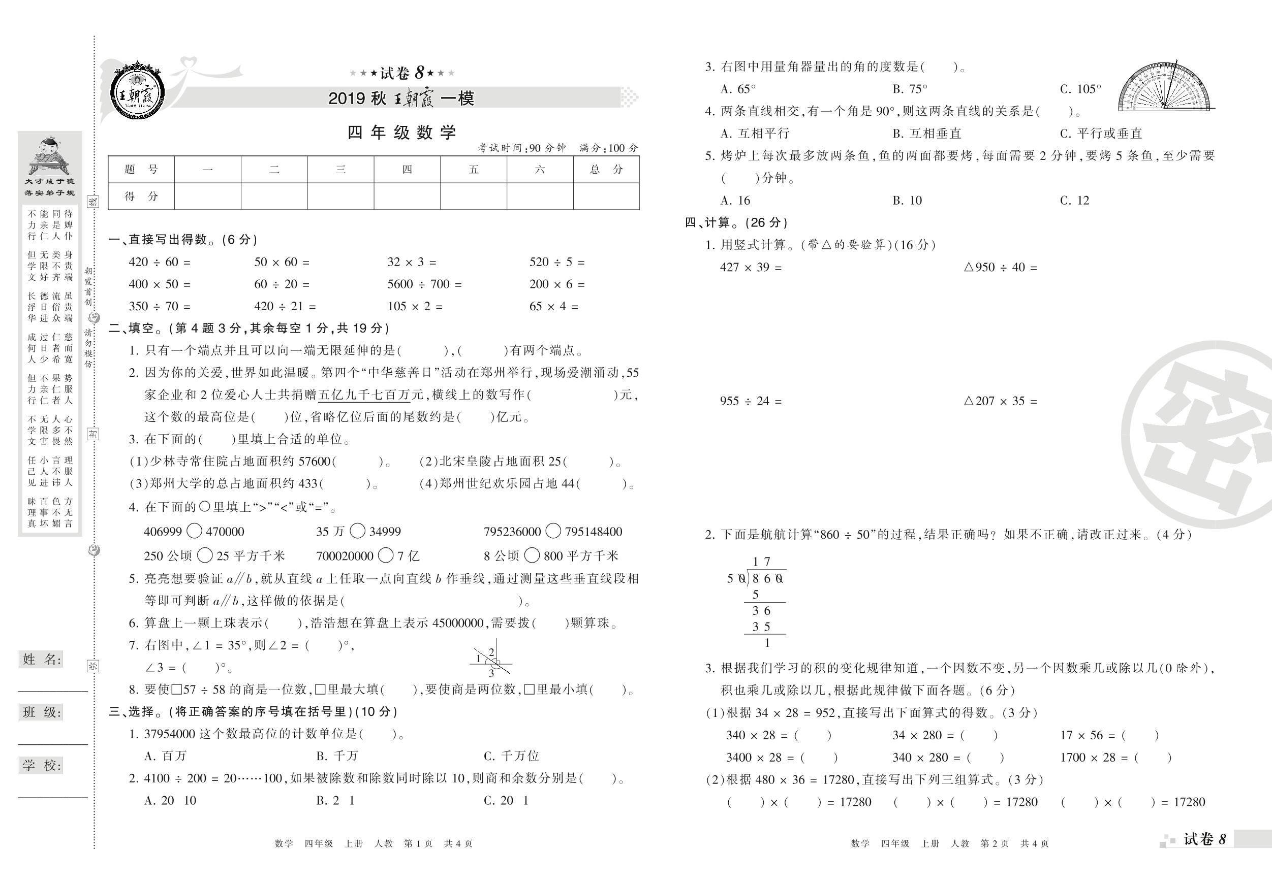王朝霞期末模拟卷四年级上册数学(人教版)_R210804145557【8】