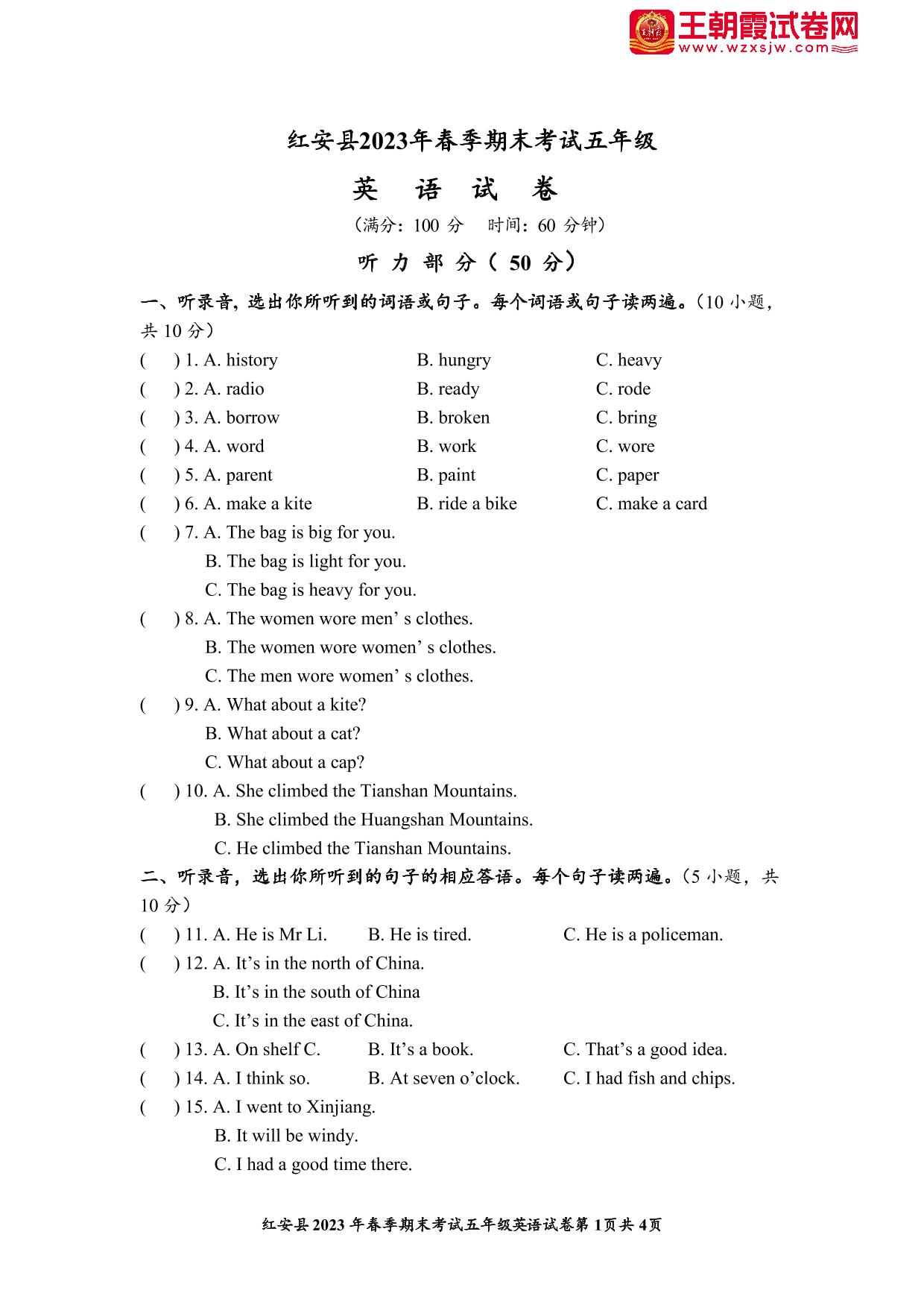 湖北省黄冈市红安县2023年春季期末考试试卷五年级英语(外研版)【无听力音频】