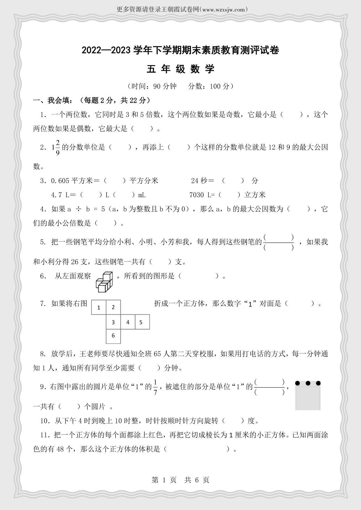 湖北省黄冈市武穴市2022-2023学年下学期期末素质教育测评试卷五年级数学(人教版)