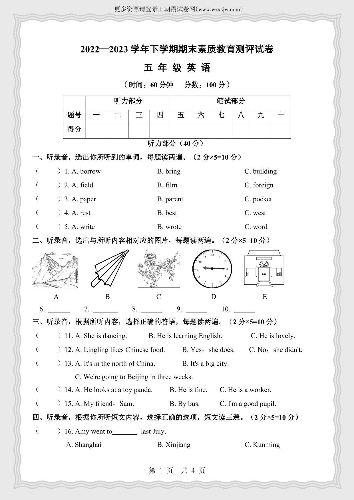 五年级英语外研版(三起始)下册期末卷