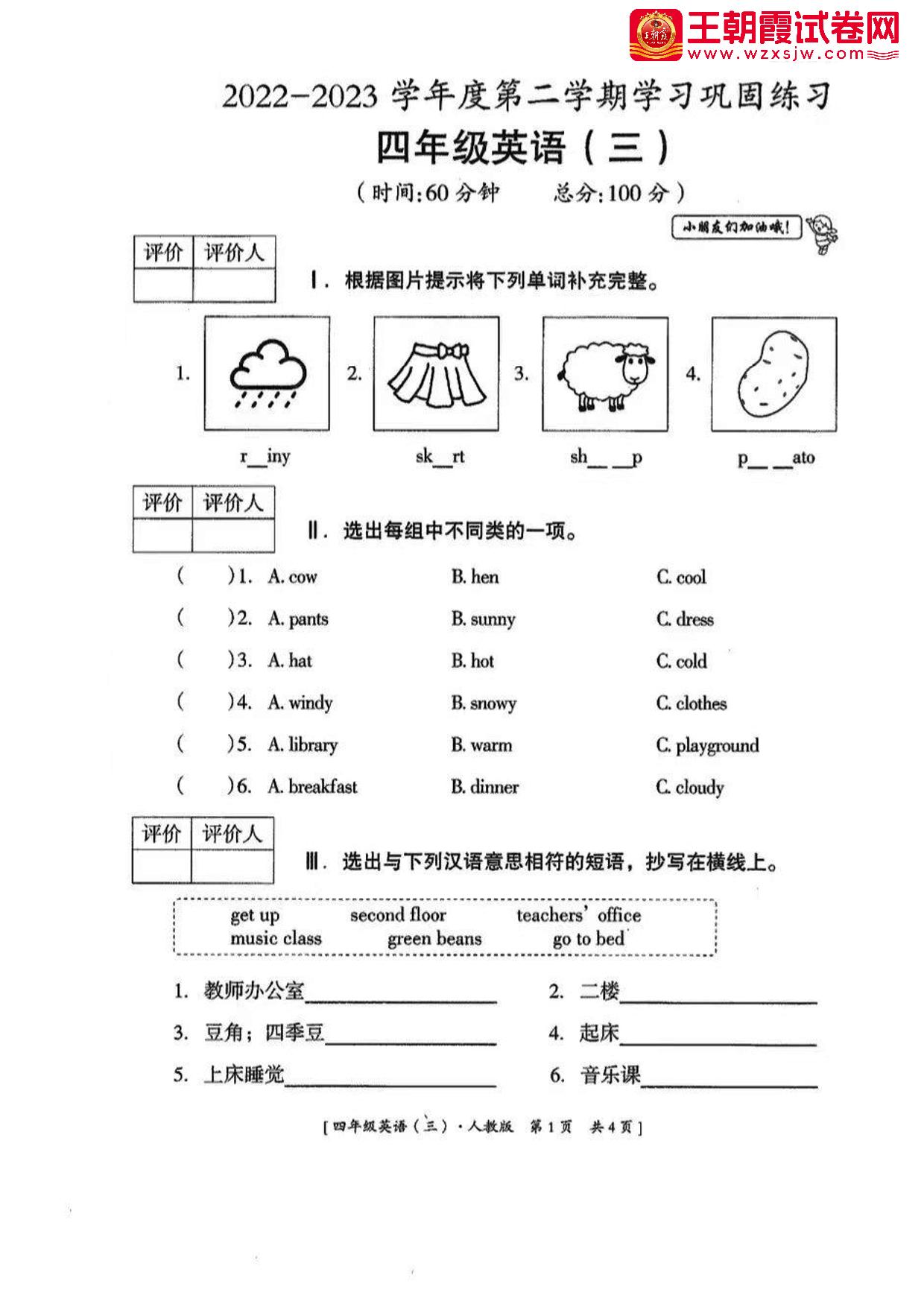 甘肃省庆阳市正宁县2022-2023学年度第二学期期末学习巩固练习四年级英语(人教PEP版)