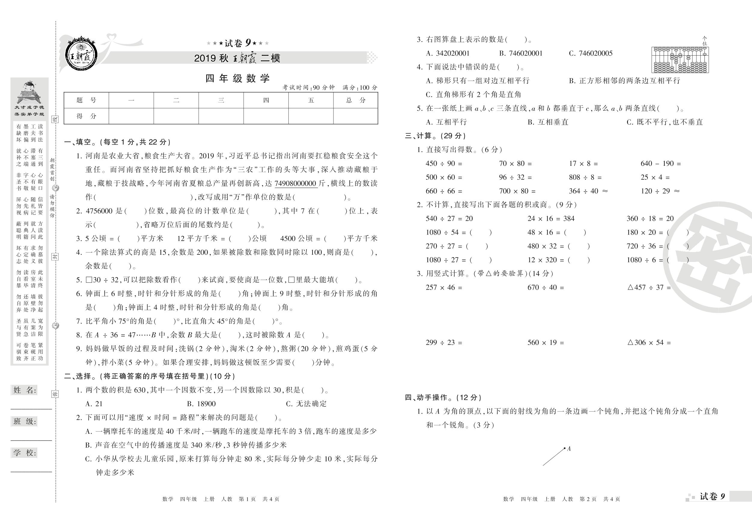 王朝霞期末模拟卷四年级上册数学(人教版)_R210804145600【9】