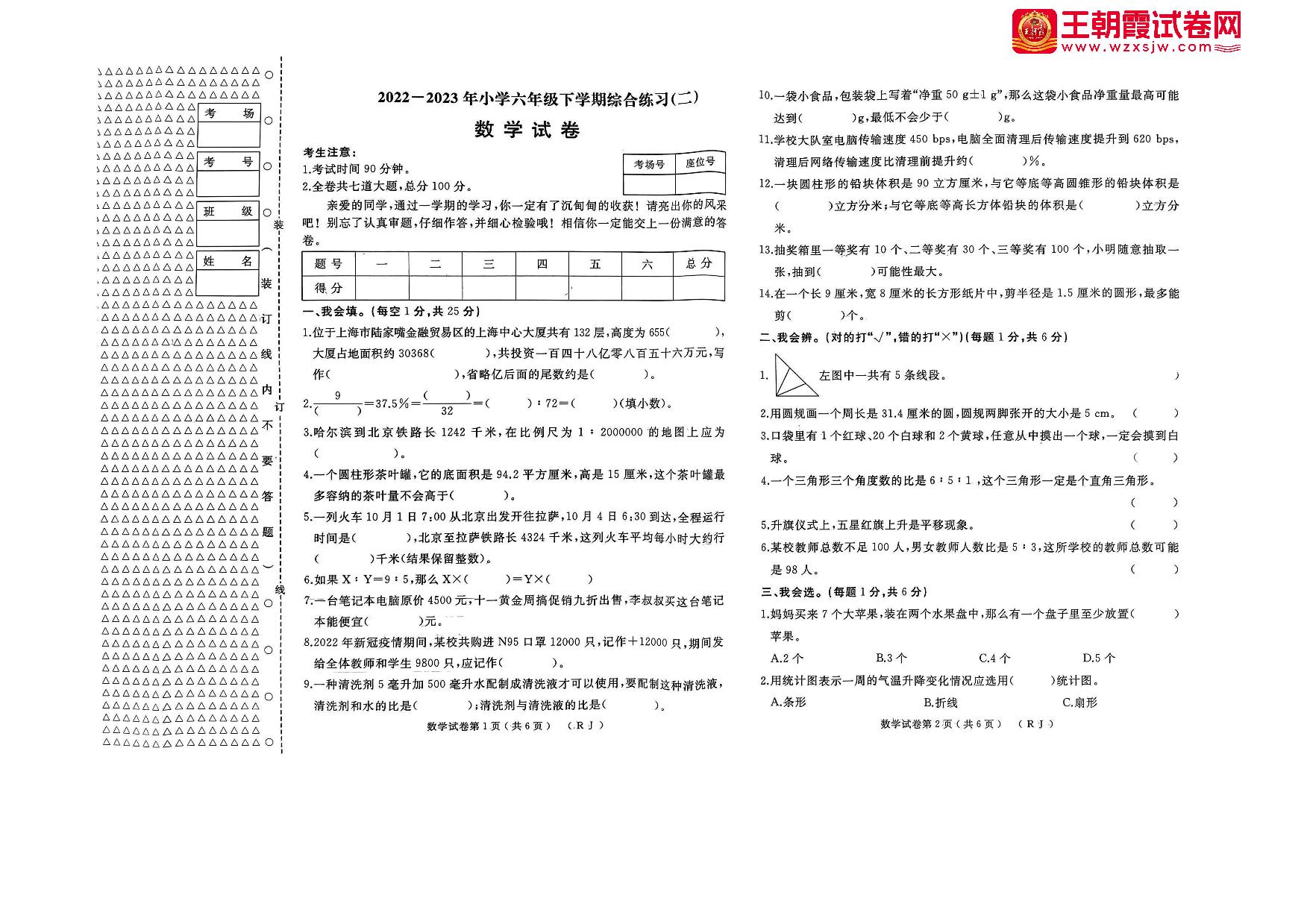 六年级数学人教版下册期末卷