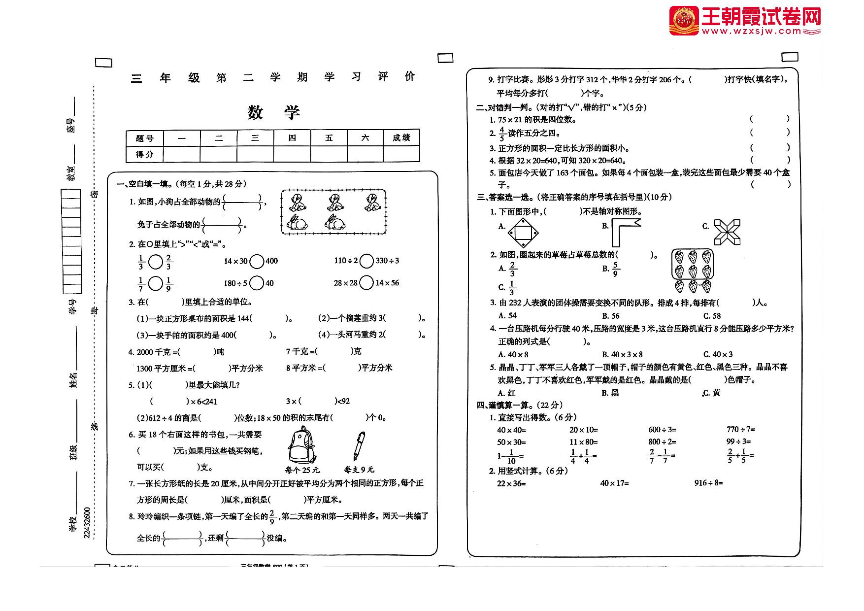 黑龙江省大兴安岭地区塔河县2022-2023学年第二学期期末学习评价三年级数学(人教版)