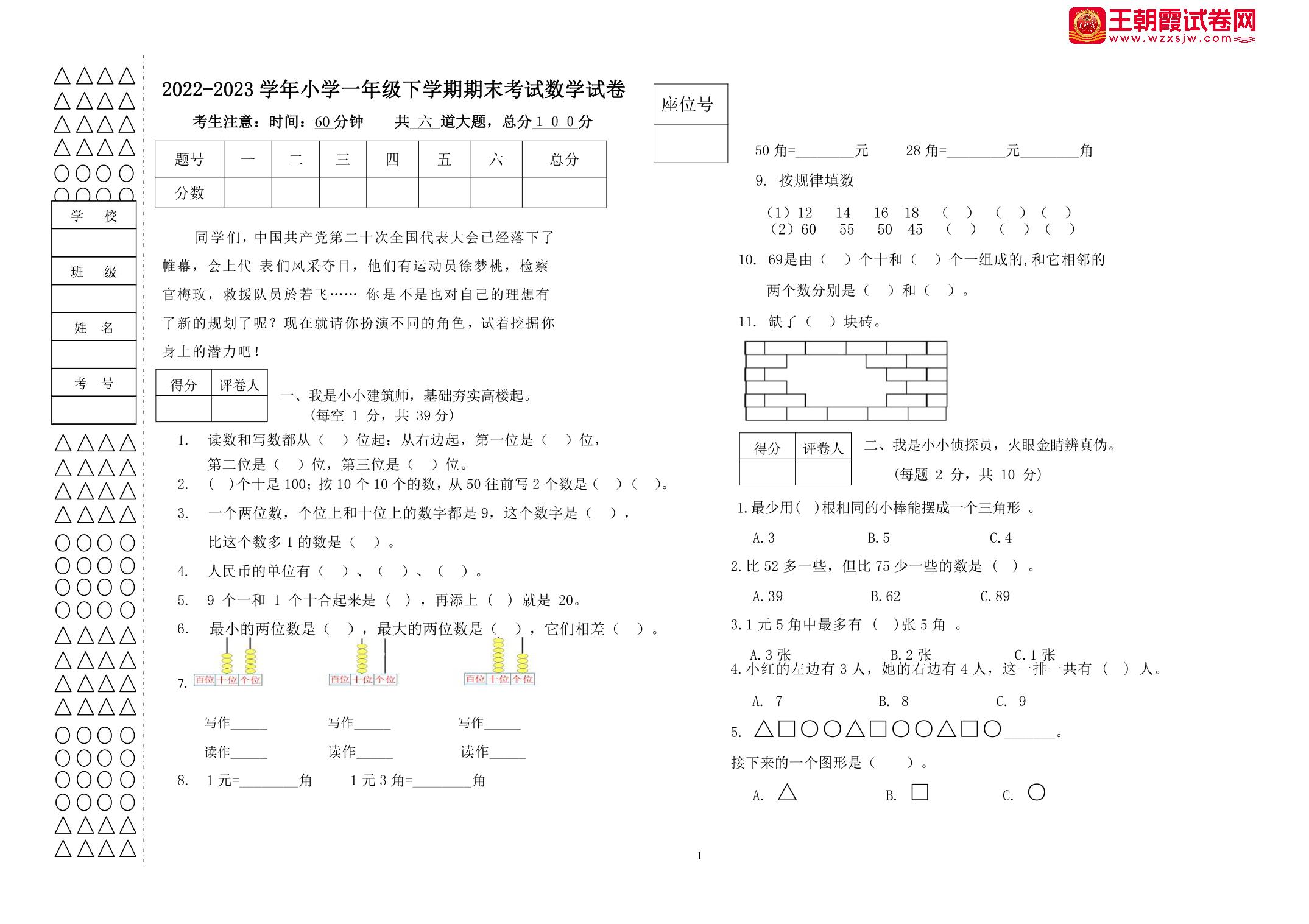 黑龙江省佳木斯市同江市东部六校联考2022-2023学年下学期期末考试试卷一年级数学(人教版)