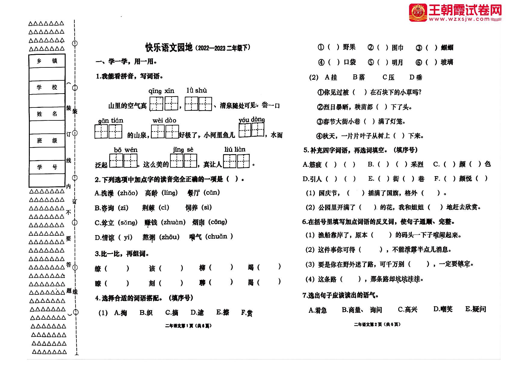 黑龙江省双鸭山市宝清县2022-2023学年下学期期末考试二年级语文(人教版)