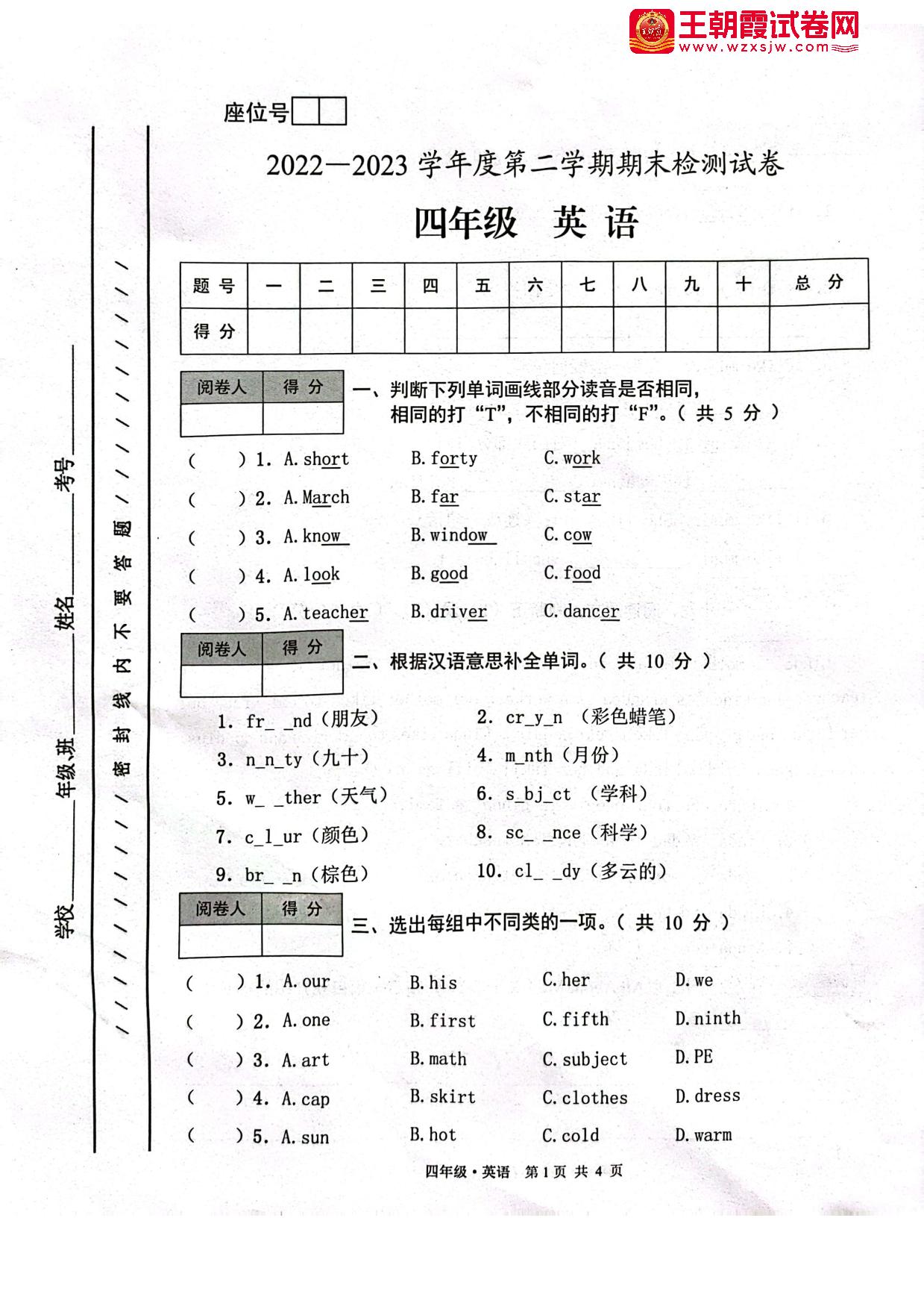 甘肃省白银市靖远县2022-2023学年度第二学期期末检测试卷四年级英语(冀教版)