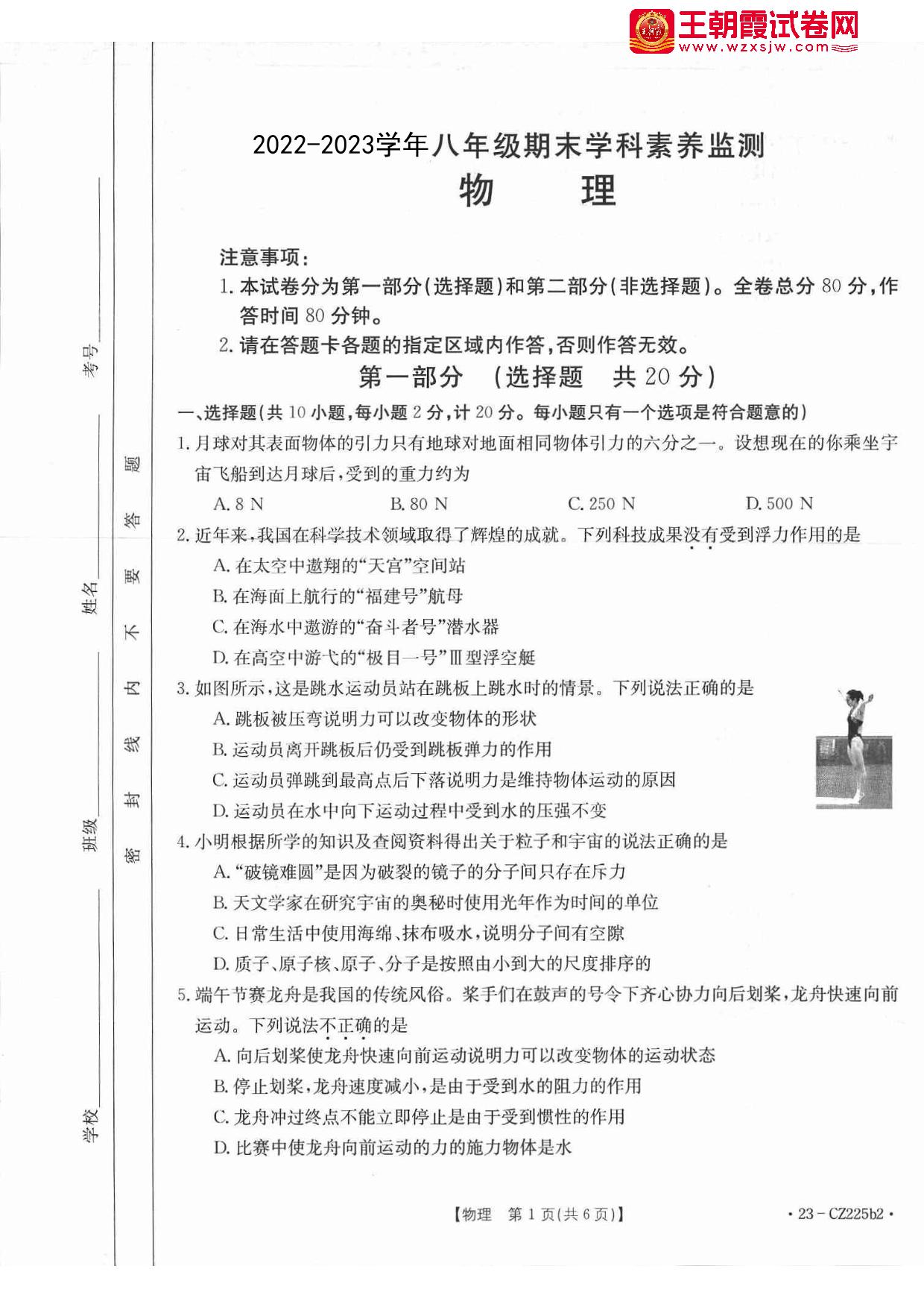 陕西省延安市富县2022-2023学年下学期期末学科素养监测八年级物理(人教版)