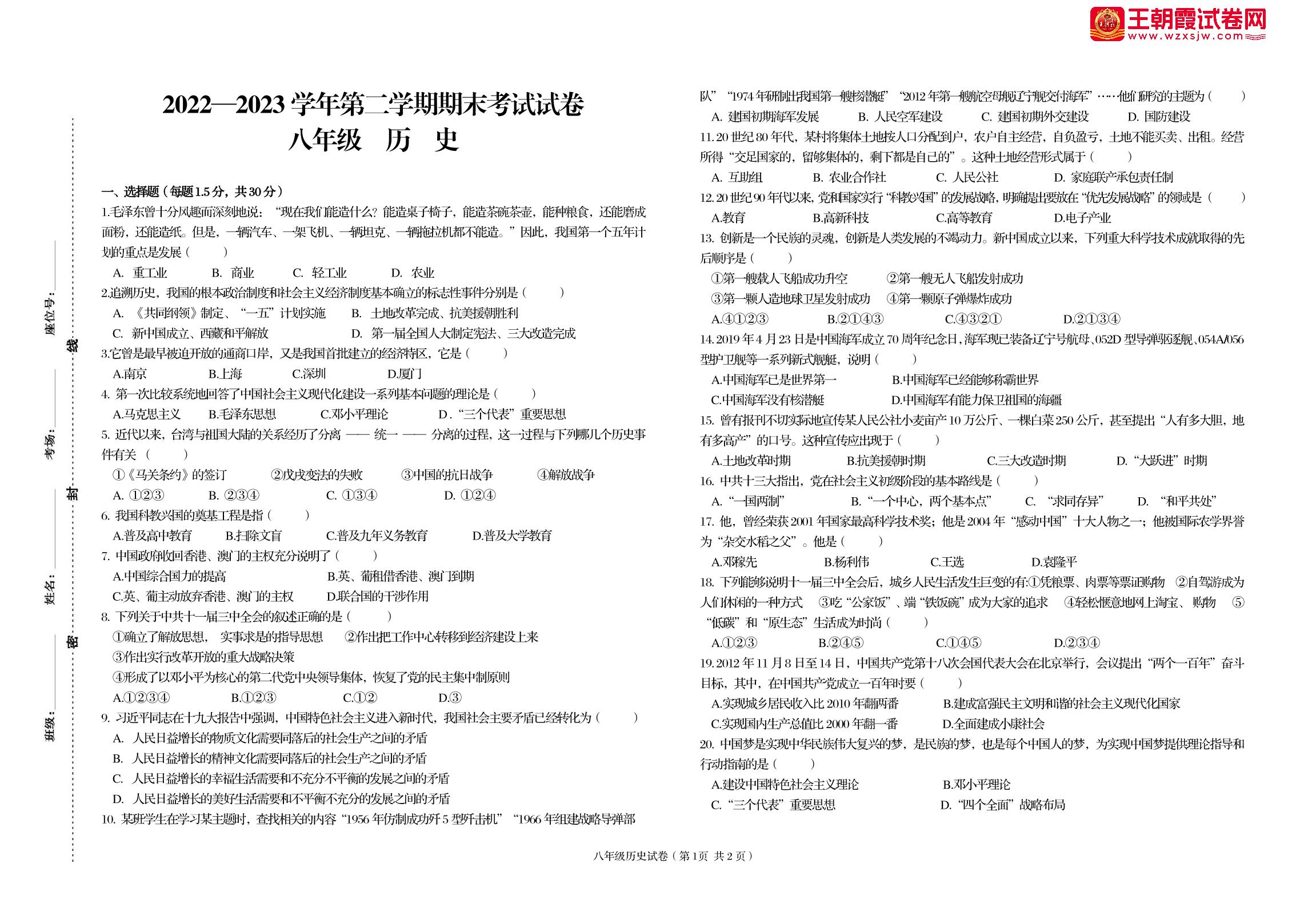 八年级历史人教版下册期末卷