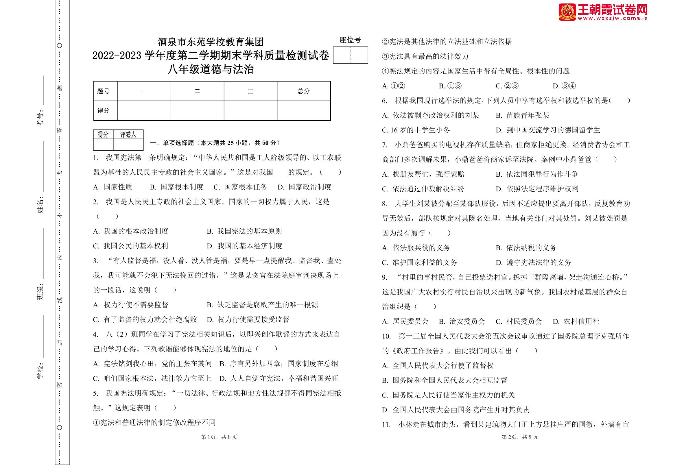 甘肃省酒泉市东苑学校教育集团2022-2023学年度第二学期期末学科质量检测试卷八年级道德与法治(人教版)