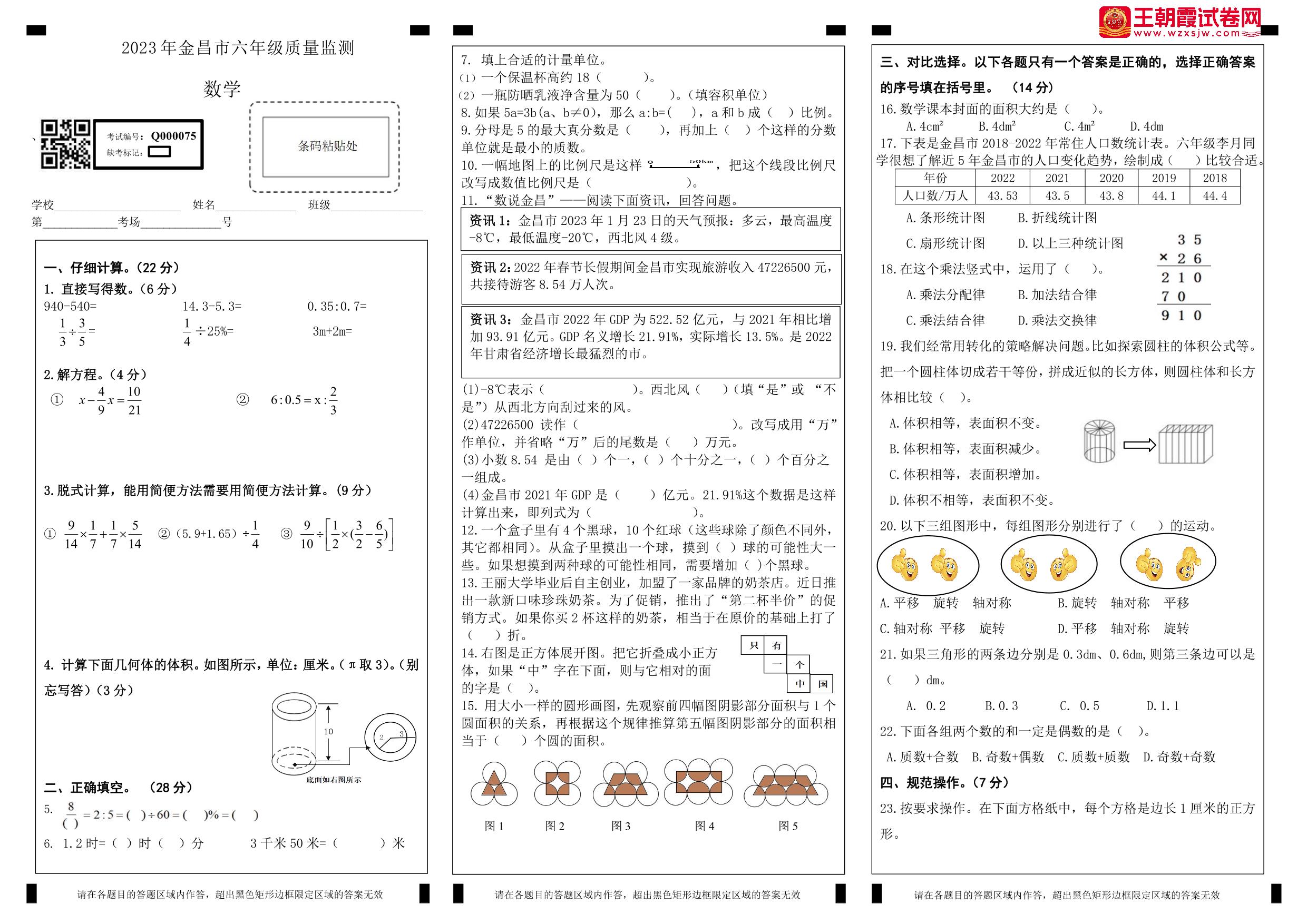 甘肃省金昌市2022-2023学年度下学期期末质量监测六年级数学(人教版)