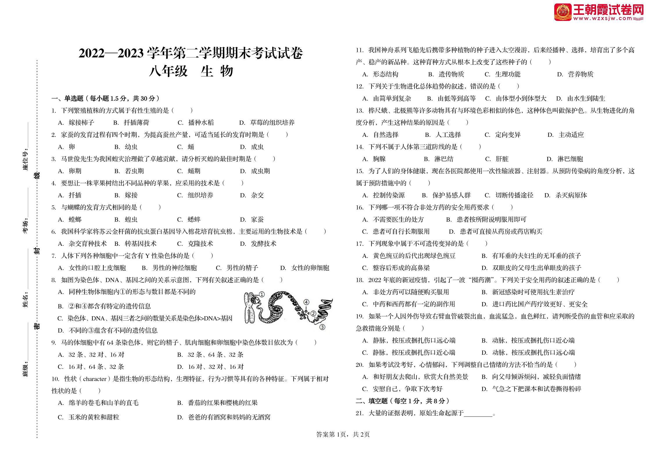 甘肃省武威市四校联考2022-2023学年第二学期期末考试试卷八年级生物(人教版)