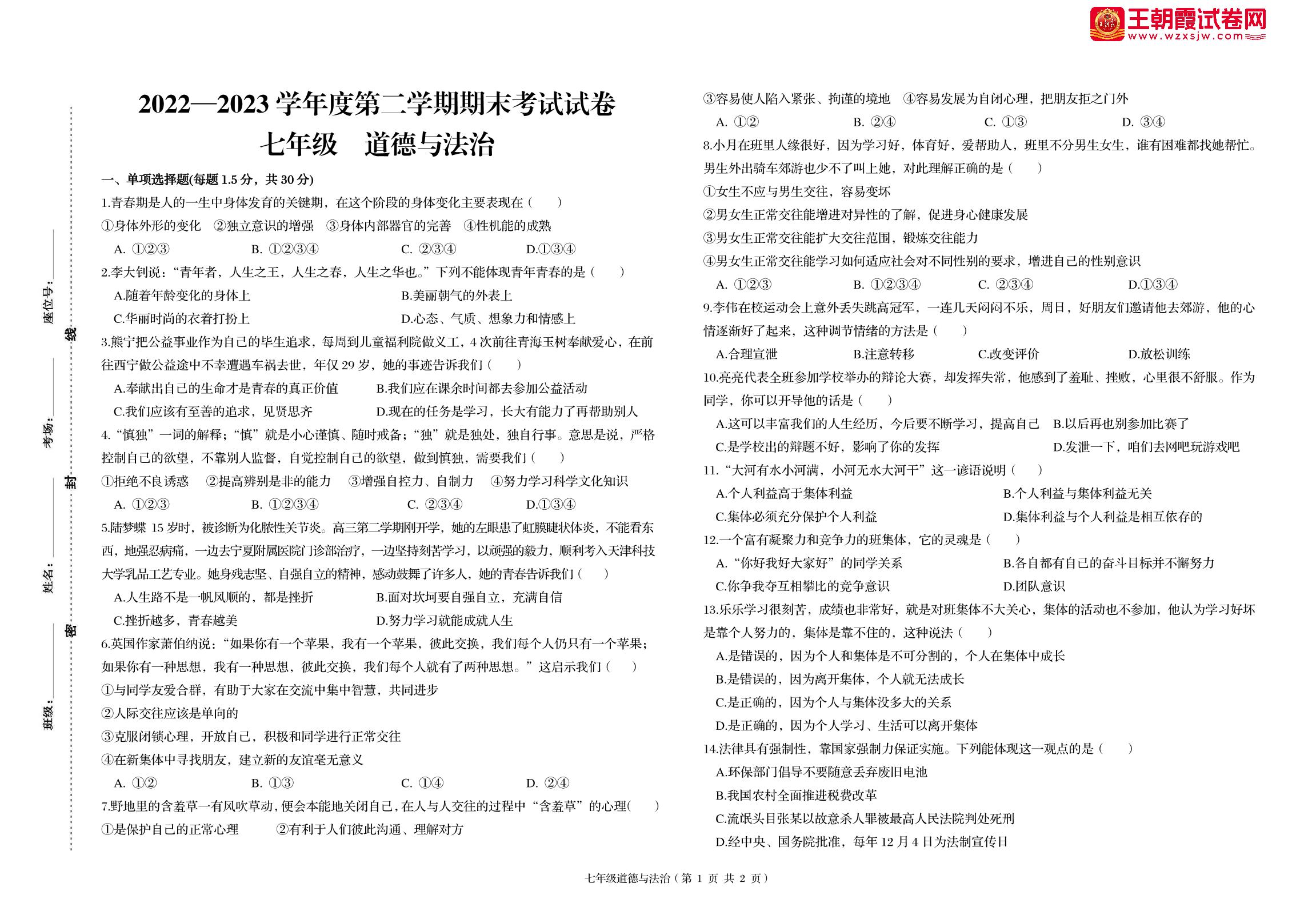 甘肃省武威市四校联考2022-2023学年度第二学期期末考试试卷七年级道德与法治(人教版)
