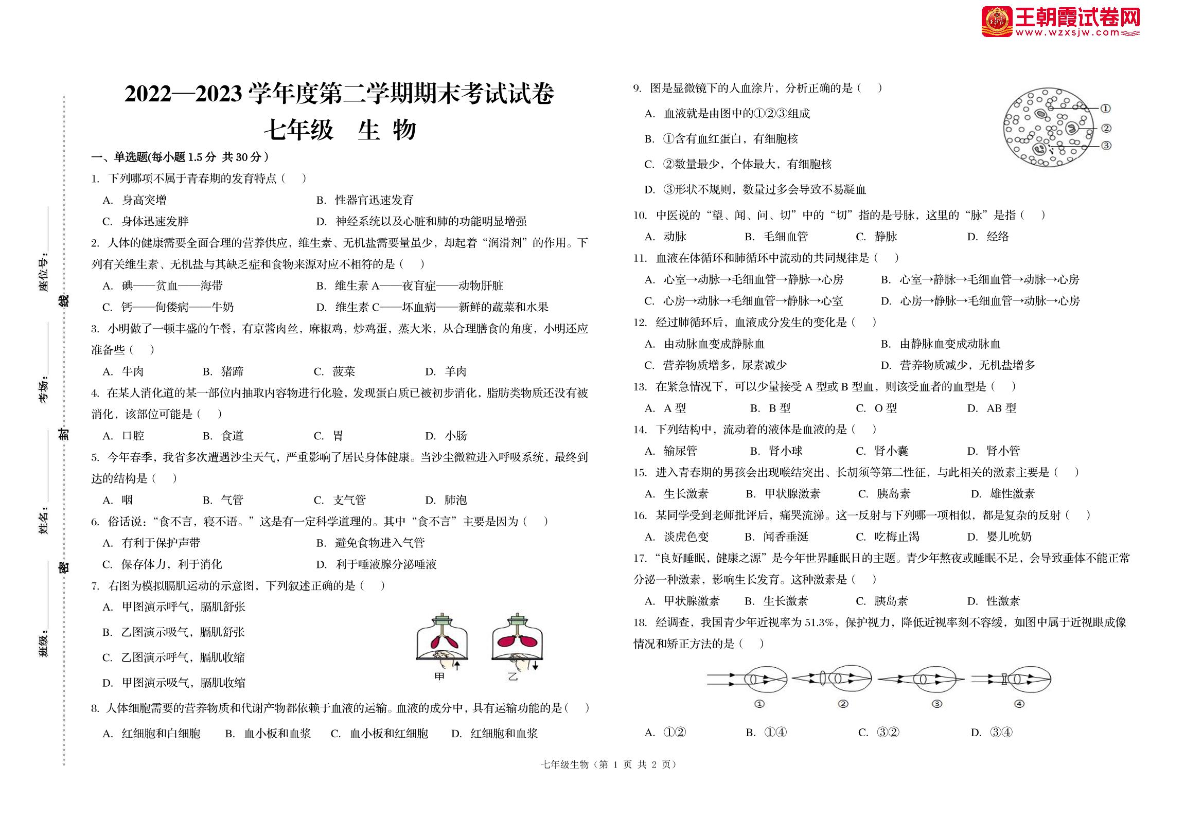 甘肃省武威市四校联考2022-2023学年度第二学期期末考试试卷七年级生物(人教版)
