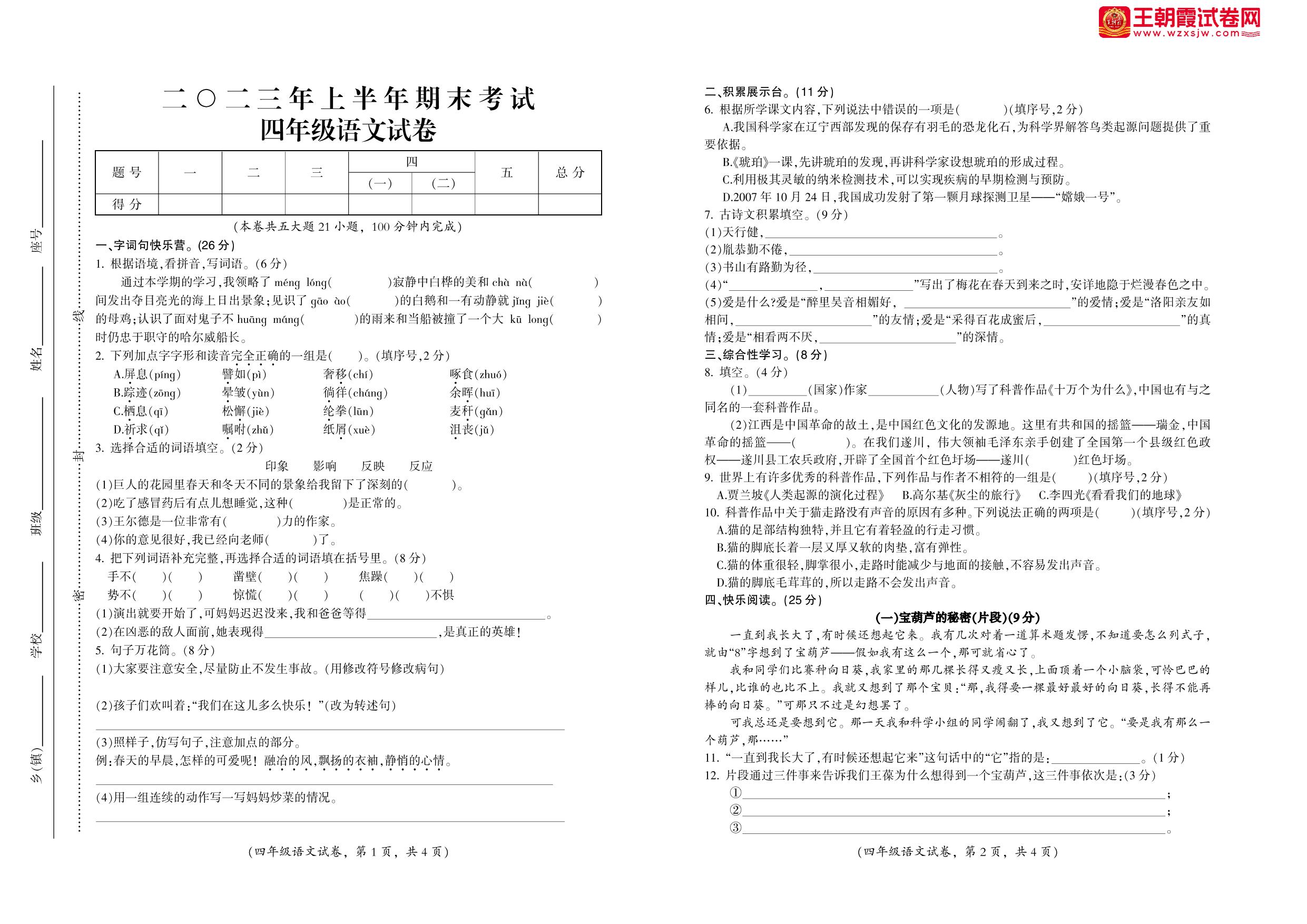 江西省吉安市遂川县2022-2023学年度第二学期期末考试试卷四年级语文(人教版)