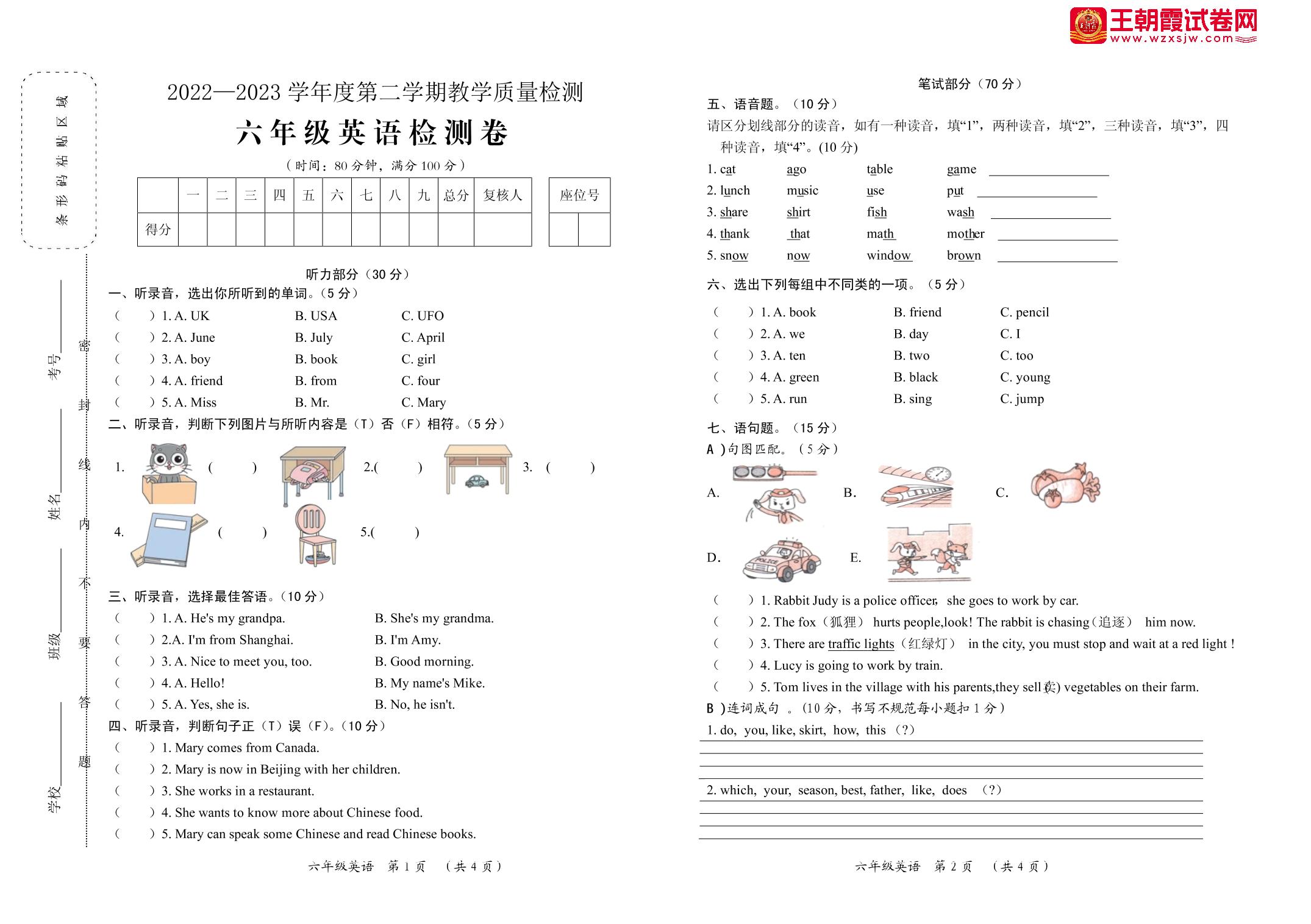 六年级英语人教PEP版(三起始)下册期末卷