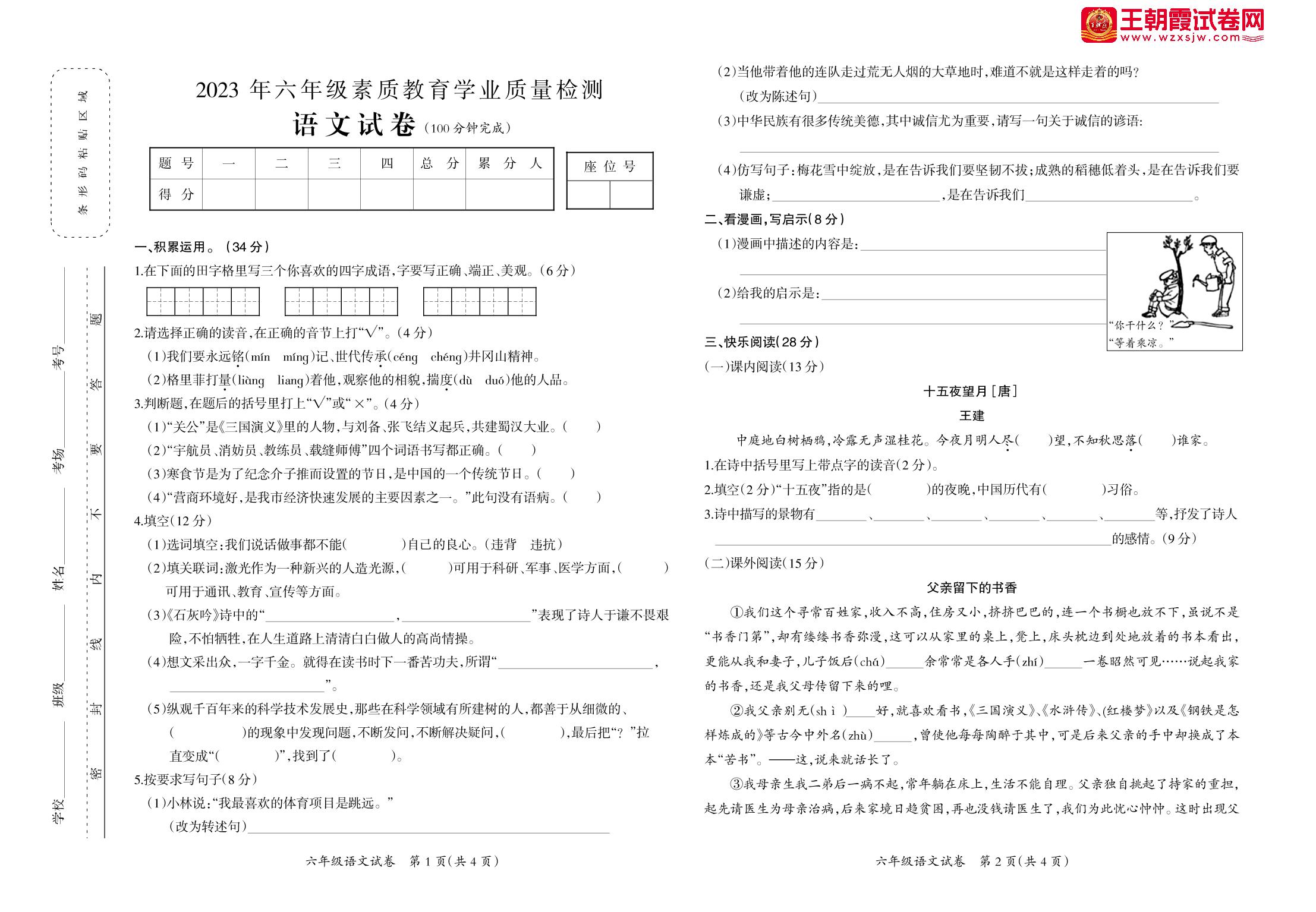 江西省井冈山市2022-2023学年度第二学期期末教学质量检测试卷六年级语文(人教版)