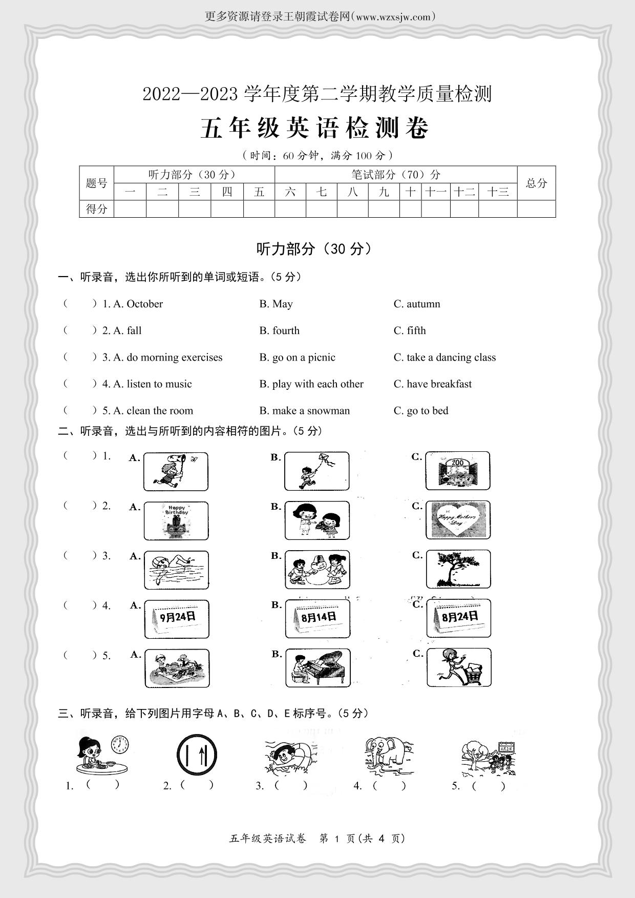 江西省井冈山市2022-2023学年度第二学期期末教学质量检测试卷五年级英语(人教PEP版)【无听力音频】