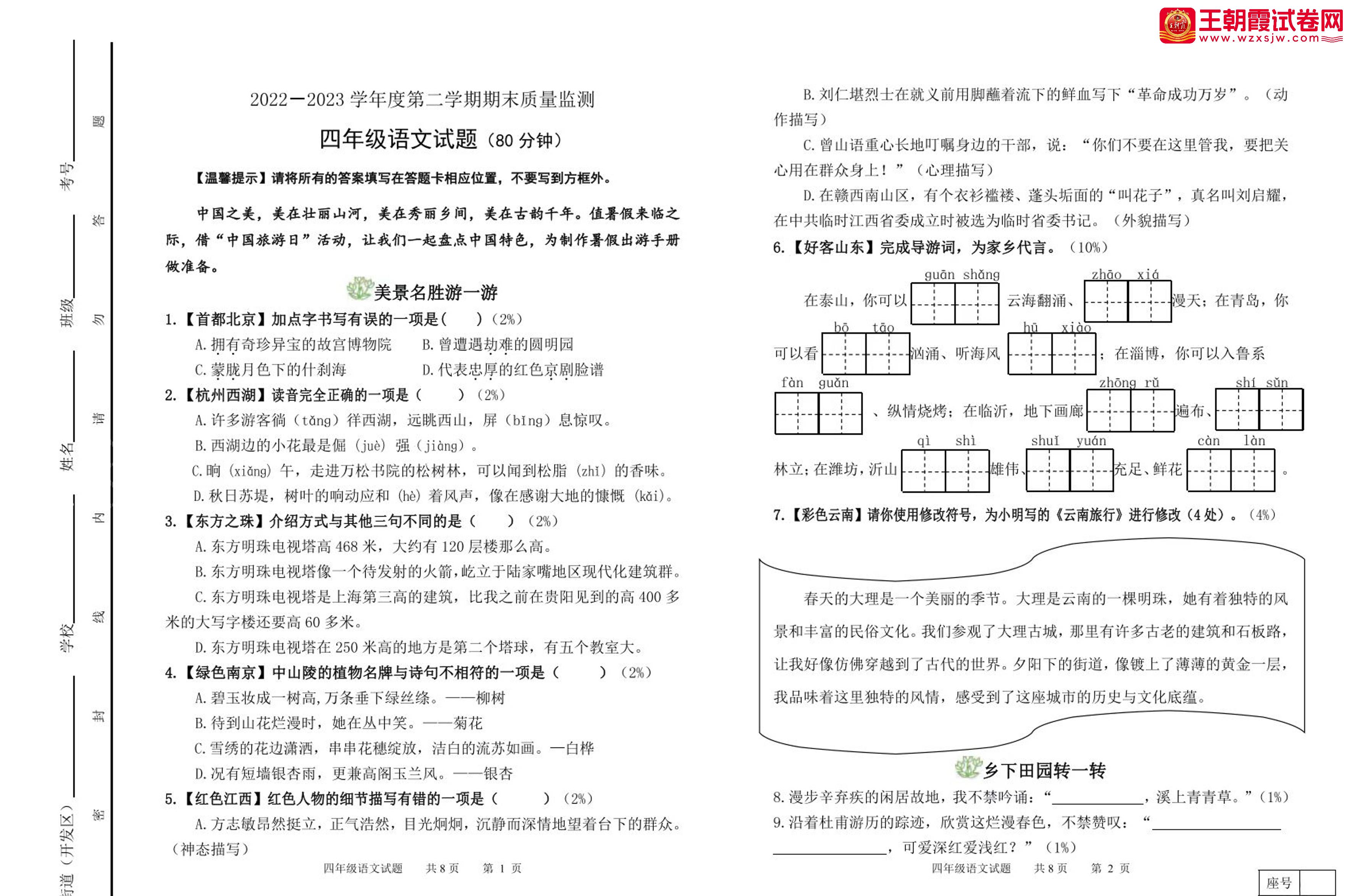 山东省潍坊市寒亭区2022-2023学年度第二学期期末质量监测四年级语文(人教版)