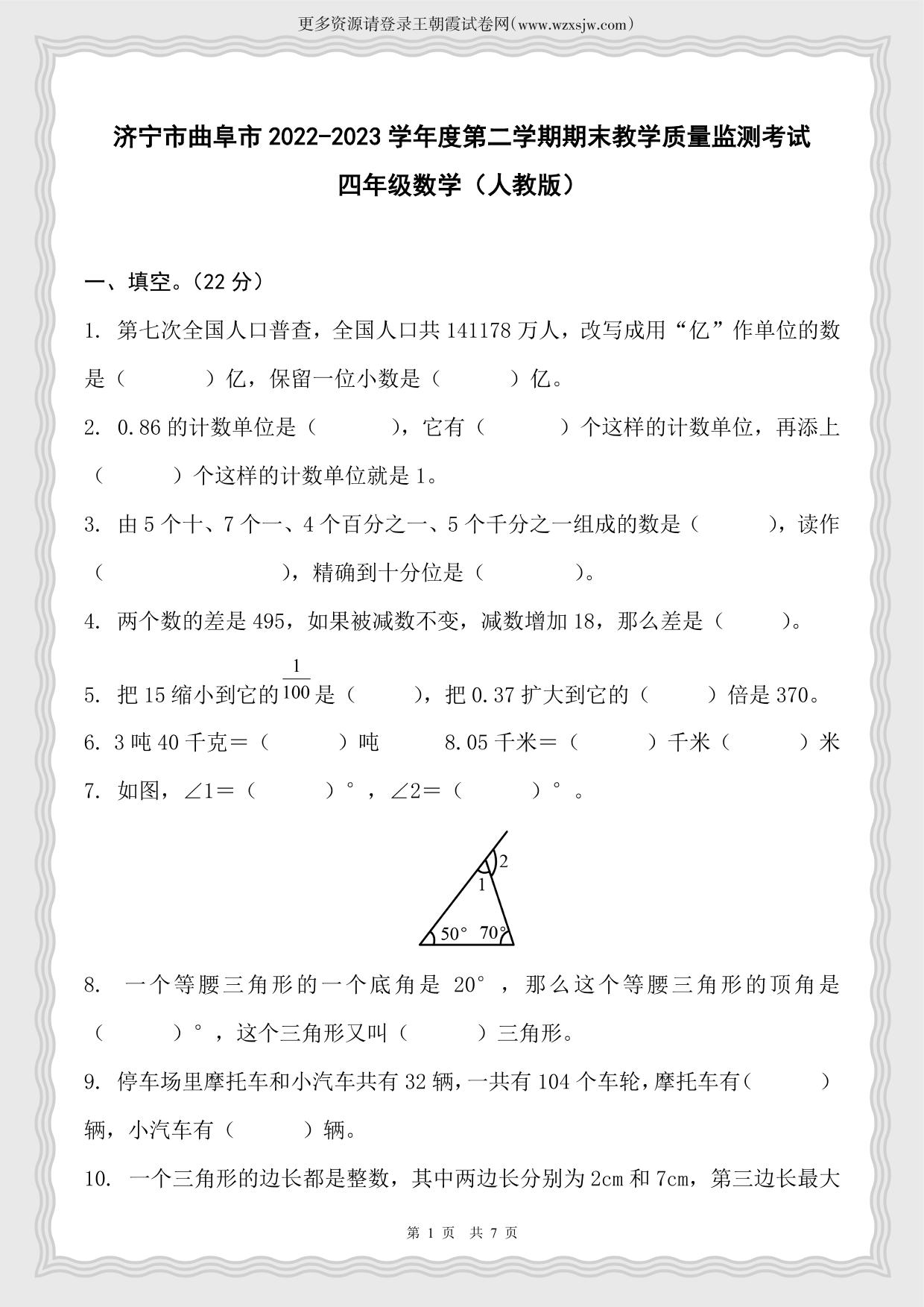 山东省济宁市曲阜市2022-2023学年度第二学期期末教学质量监测考试四年级数学(人教版)