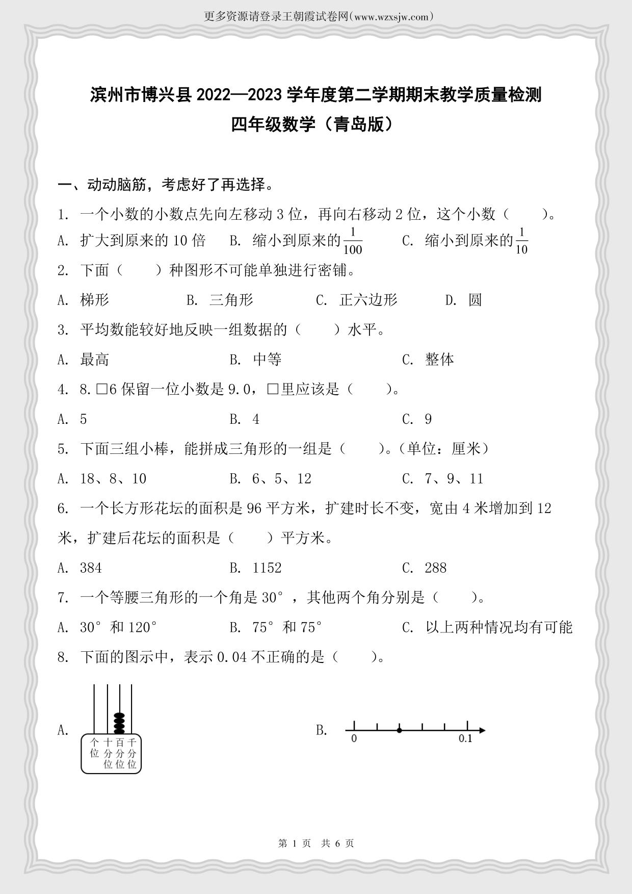 山东省滨州市博兴县2022-2023学年度第二学期期末教学质量检测四年级数学(青岛版)