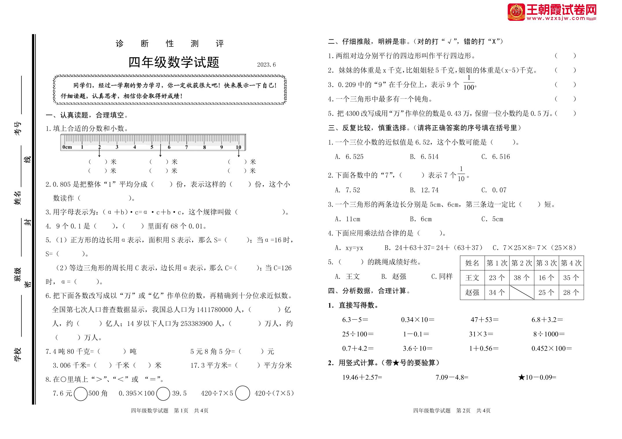 山东省枣庄市薛城区2022-2023学年下学期期末诊断学测评四年级数学(青岛版)