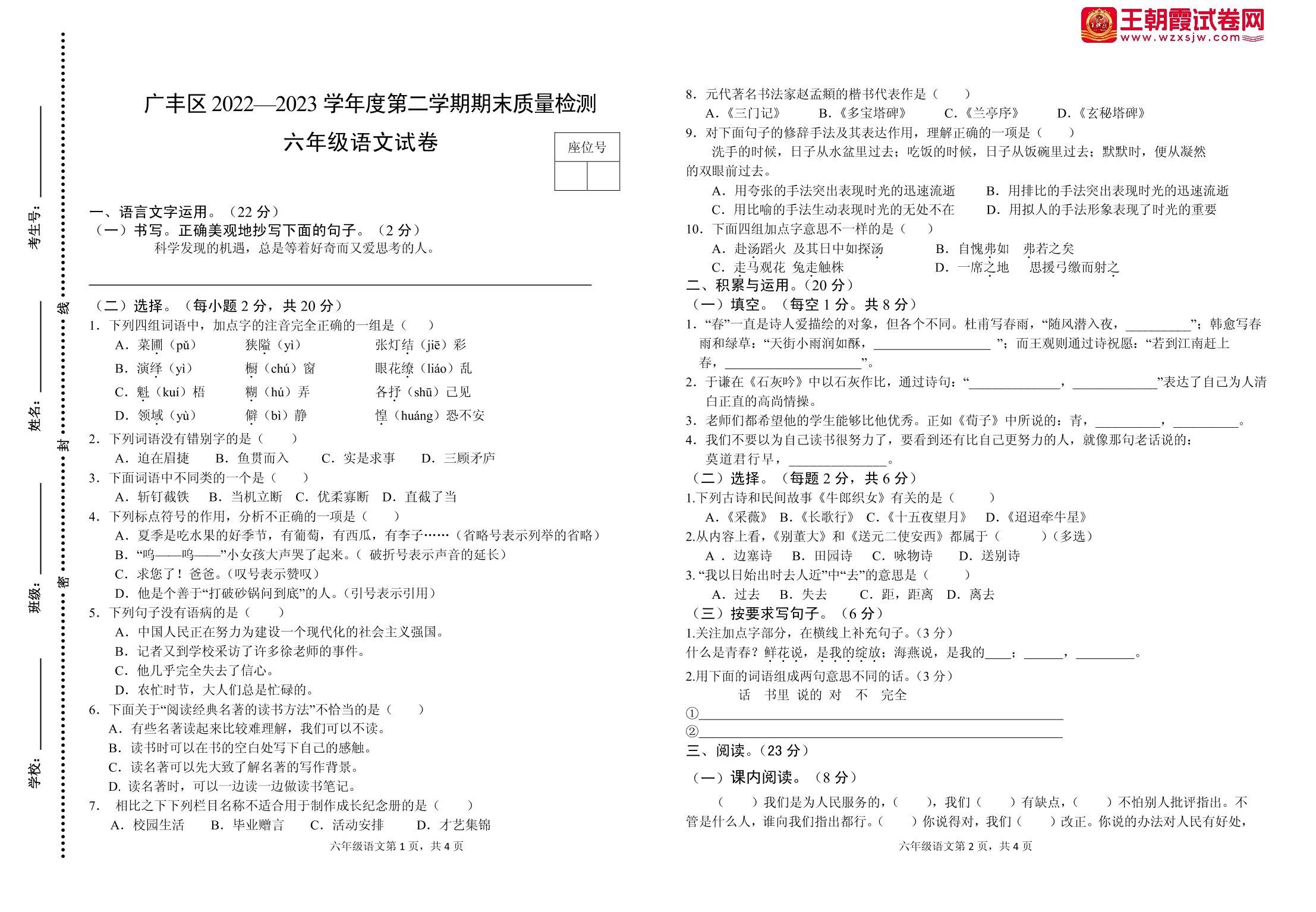 江西省上饶市广丰区2022-2023学年度第二学期期末质量检测试卷六年级语文(人教版)