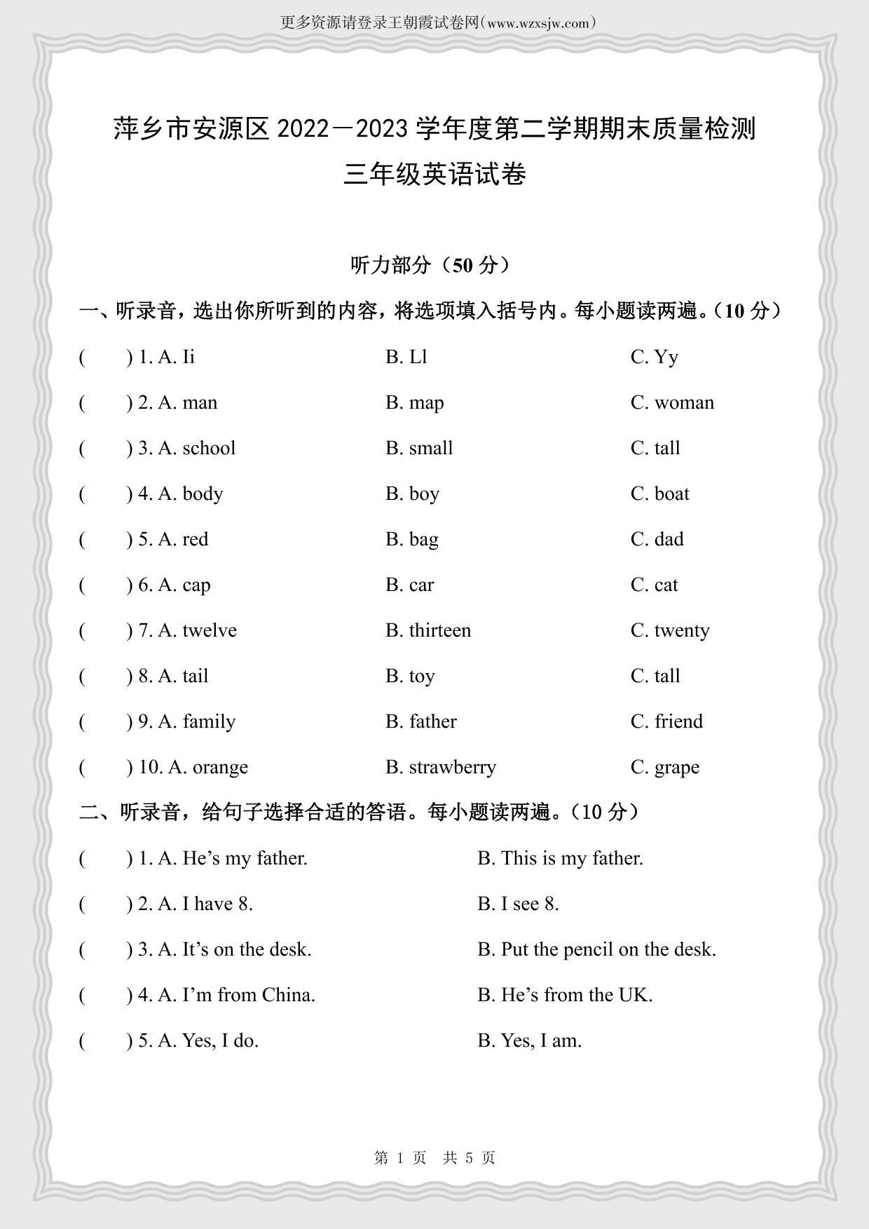 江西省萍乡市安源区2022-2023学年度第二学期期末质量检测试卷三年级英语(人教PEP版)【无听力音频】