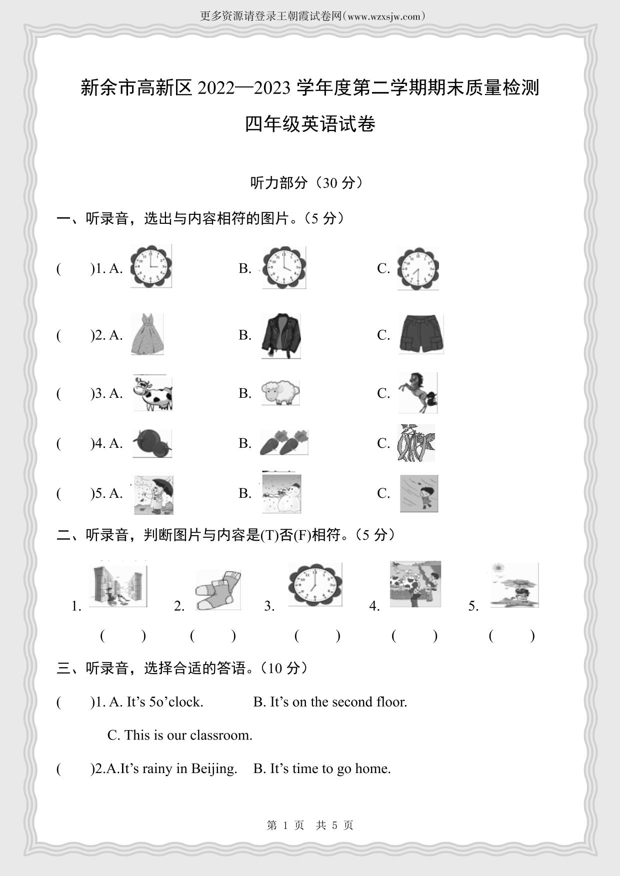 江西省新余市高新区2022-2023学年度第二学期期末质量检测试卷四年级英语(人教PEP版)