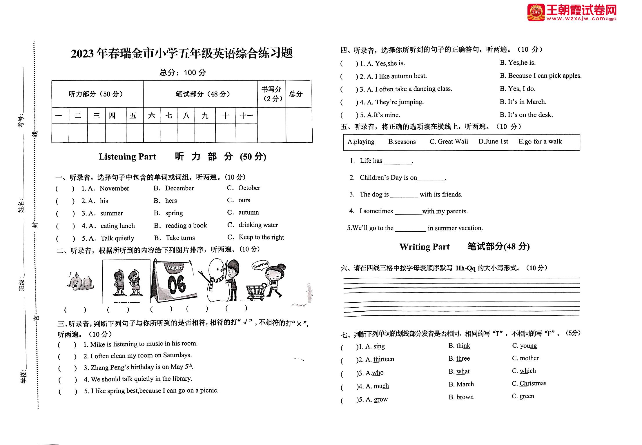 江西省赣州市瑞金市2022-2023学年度第二学期期末综合练习题五年级英语(人教PEP版)【无听力音频】