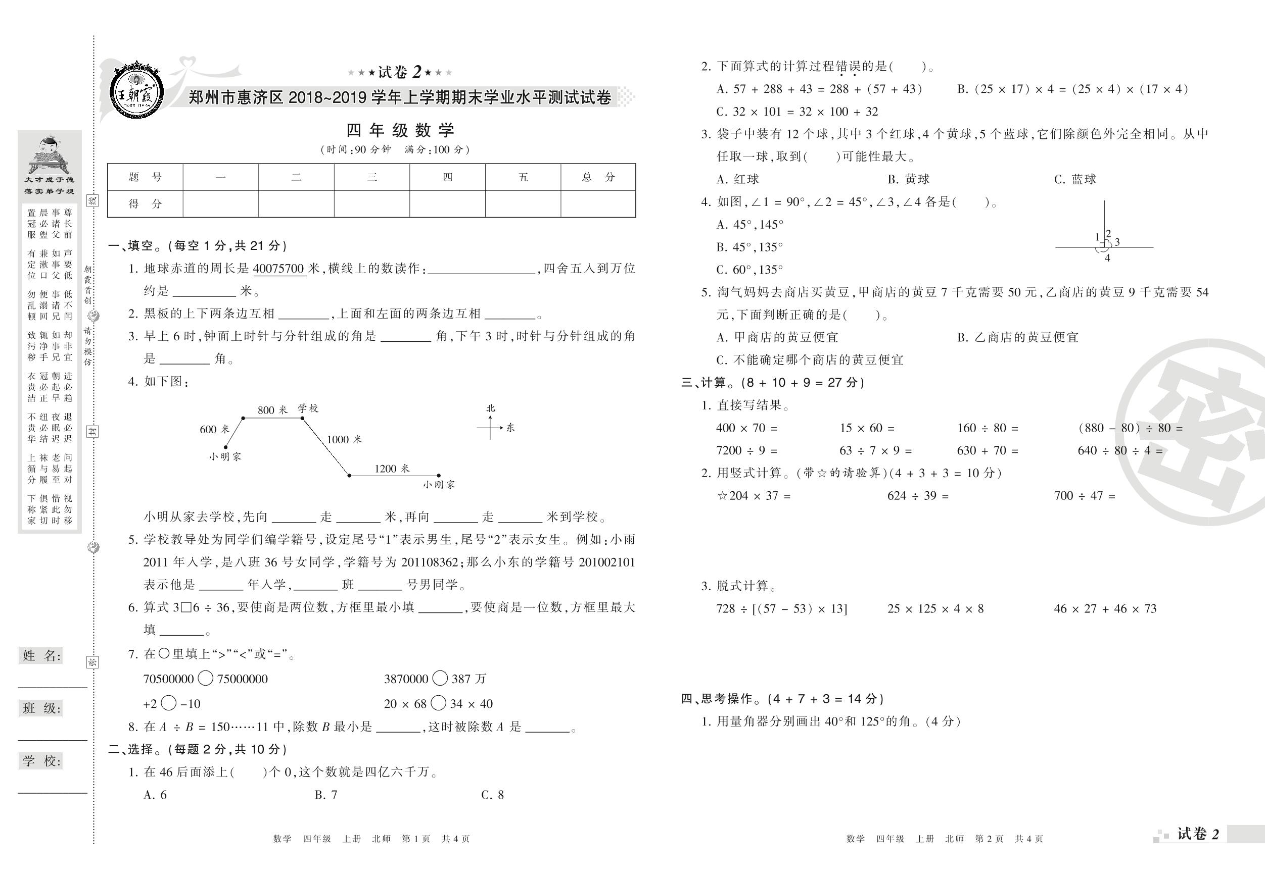 2018-2019学年第一学期郑州市惠济区四年级数学试卷(北师版)【2】