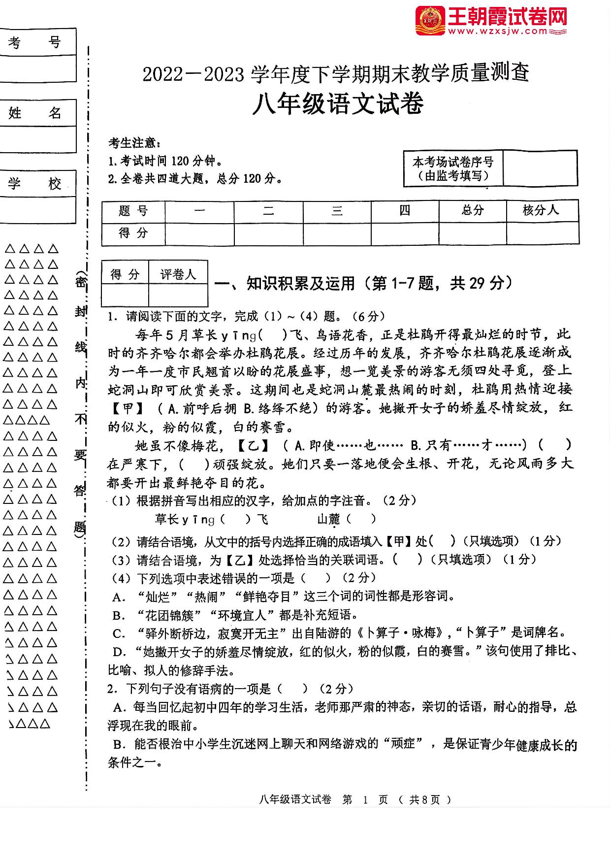 黑龙江省齐齐哈尔市龙江县2022-2023学年度下学期期末教学质量测查八年级语文(人教版)