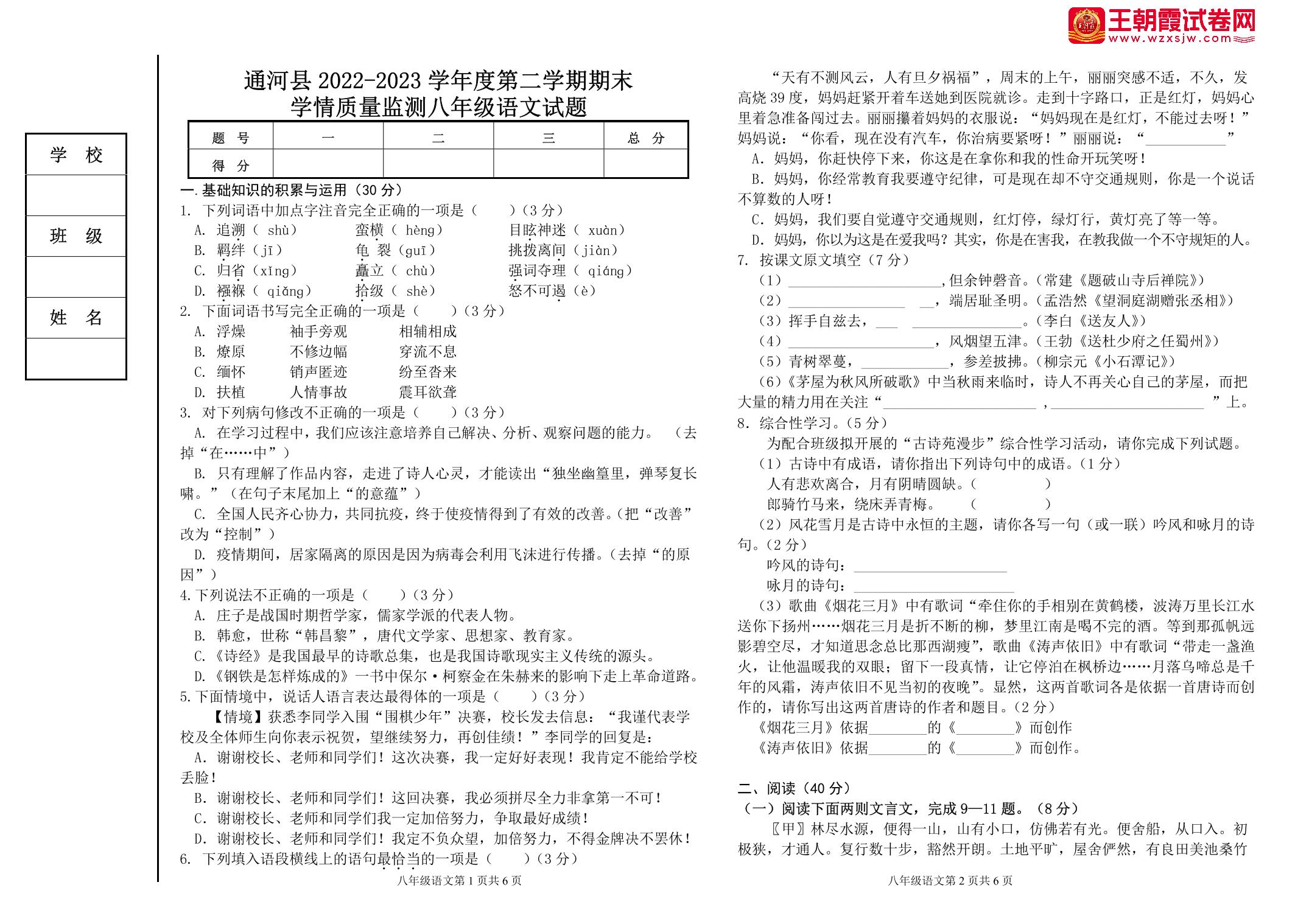 黑龙江省哈尔滨市通河县2022-2023学年度第二学期期末学情质量监测八年级语文(人教版)