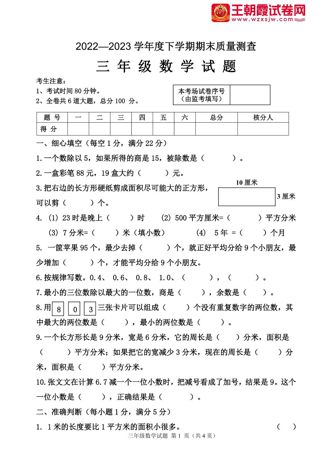 三年级数学人教版下册期末卷