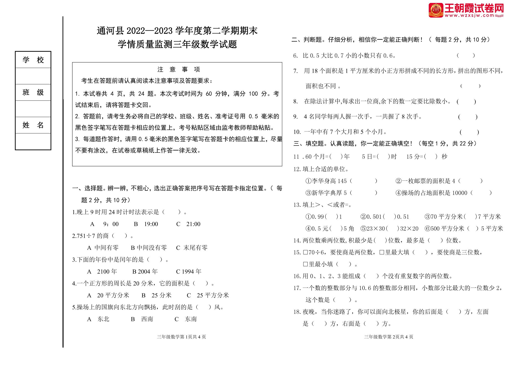 黑龙江省哈尔滨市通河县2022-2023学年度第二学期期末学情质量监测三年级数学(人教版)