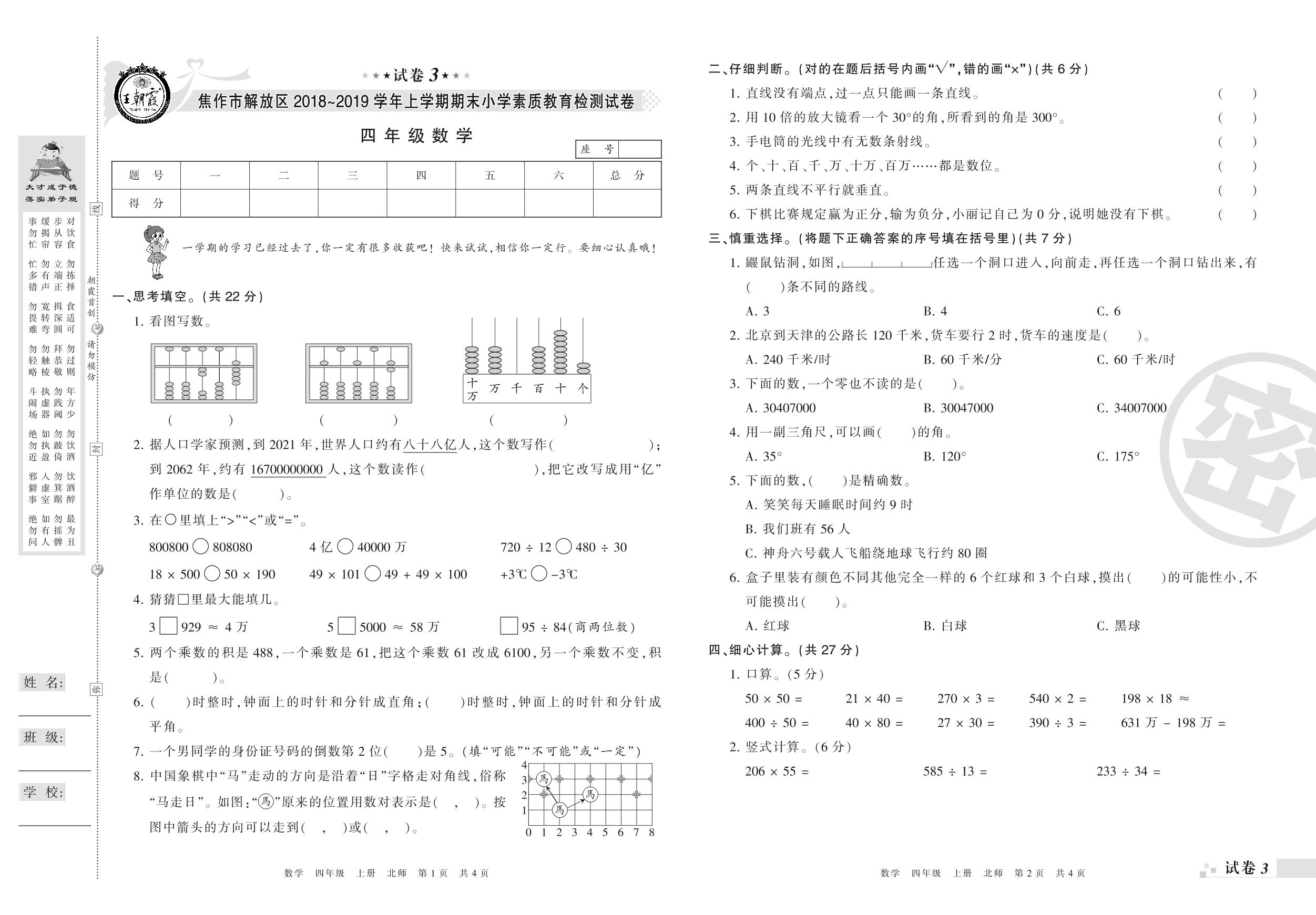 2018-2019学年第一学期焦作市解放区四年级数学试卷(北师版)【3】