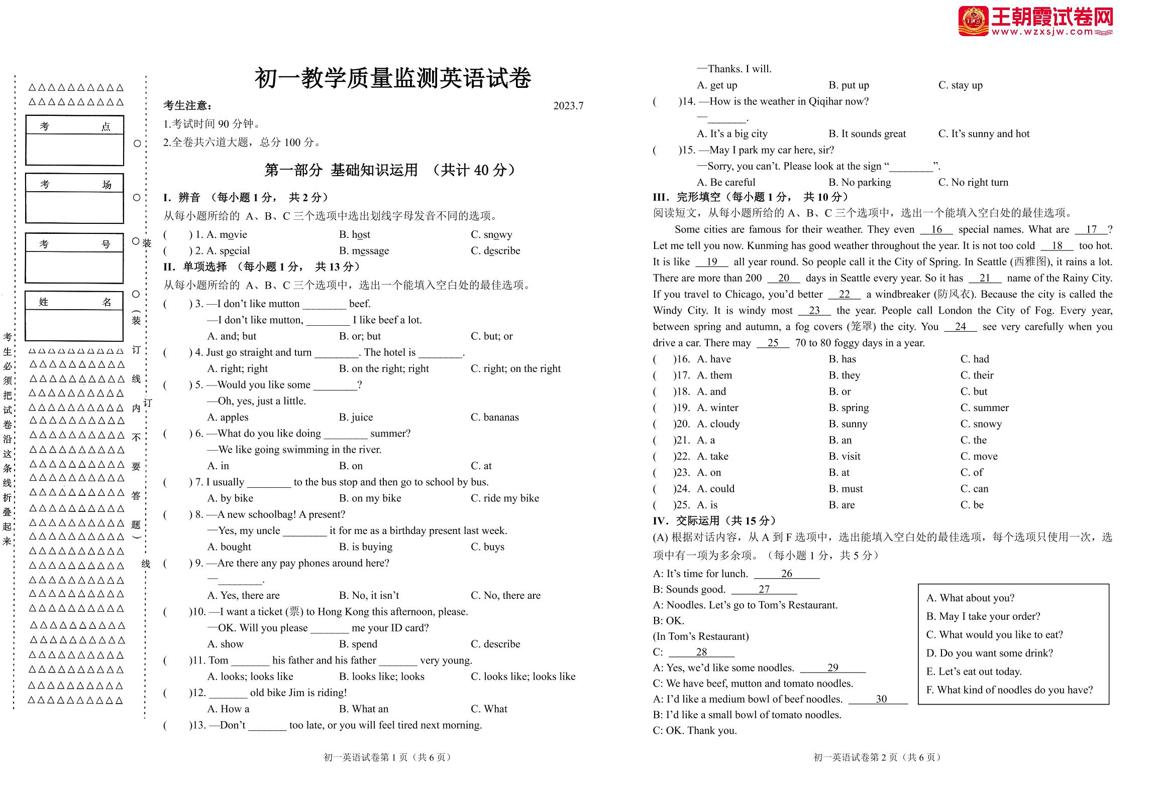 黑龙江省齐齐哈尔市铁锋区2022-2023学年下学期教学质量监测七年级英语(人教版)