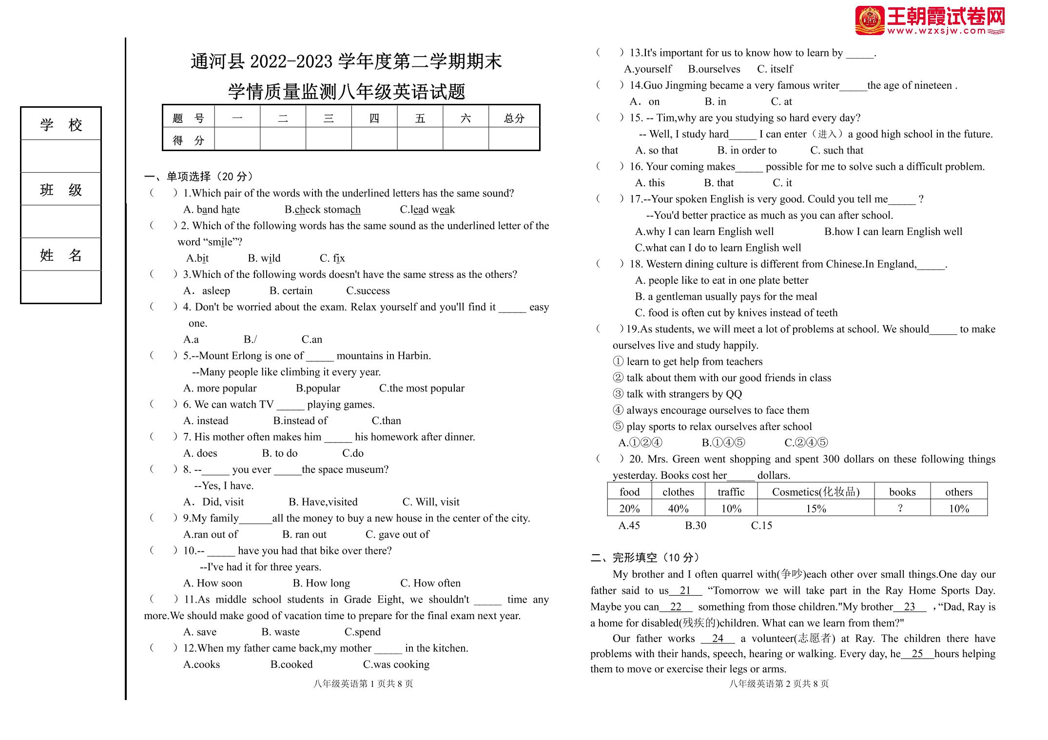 黑龙江省哈尔滨市通河县2022-2023学年度第二学期期末学情质量监测八年级英语(人教版)